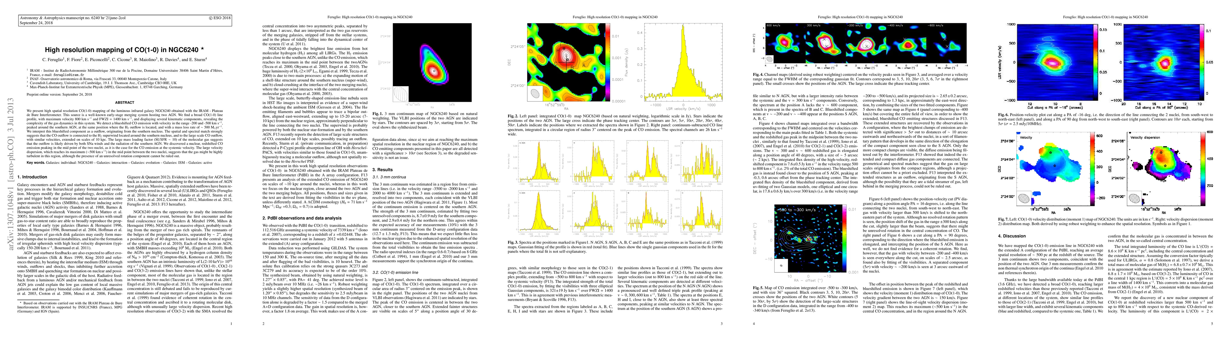 We present high spatial resolution CO(1-0) mapping of the luminous infrared galaxy NGC6240 obtained with the IRAM - Plateau de Bure Interferometer. This source is a well-known early-stage merging system hosting two AGN. We find a broad CO(1-0) line profile, with maximum velocity 800 km/s and FWZI=1400 km/s, and displaying several kinematic components, revealing the complexity of the gas dynamics in this system. We detect a blueshifted CO emission with velocity in the range -200 and -500 km/s, peaked around the southern AGN, at the same position where the H2 outflow is located, and with a mass loss rate of ~500 Msun/yr. We interpret this blueshifted component as a outflow, originating from the southern nucleus. The spatial and spectral match strongly suggests that the CO outflow is connected to the H2 superwind located around the southern nucleus, and to the large scale CO outflow, with similar velocities, extended on scales of 10 kpc. The large mass loading factor (dM/dt /SFR ~ 10) of the molecular gas suggests that the outflow is likely driven by both SNa winds and the radiation of the southern AGN. We discovered a nuclear, redshifted CO emission peaking in the mid point of the two nuclei, as it is the case for the CO emission at the systemic velocity. The large velocity dispersion, which reaches its maximum (~500 Km/s) in the mid point between the two nuclei, suggests that the gas might be highly turbulent in this region, although the presence of an unresolved rotation component cannot be ruled out.