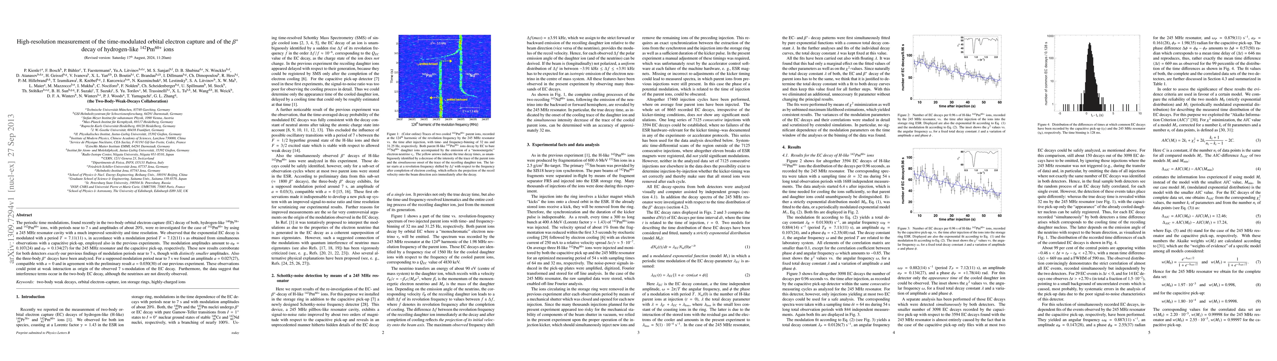 The periodic time modulations, found recently in the two-body orbital electron-capture (EC) decay of both, hydrogen-like $^{140}$Pr$^{58+}$ and $^{142}$Pm$^{60+}$ ions, with periods near to 7s and amplitudes of about 20%, were re-investigated for the case of $^{142}$Pm$^{60+}$ by using a 245 MHz resonator cavity with a much improved sensitivity and time resolution. We observed that the exponential EC decay is modulated with a period $T = 7.11(11)$s, in accordance with a modulation period $T = 7.12(11)$ s as obtained from simultaneous observations with a capacitive pick-up, employed also in the previous experiments. The modulation amplitudes amount to $a_R = 0.107(24)$ and $a_P = 0.134(27)$ for the 245 MHz resonator and the capacitive pick-up, respectively. These new results corroborate for both detectors {\it exactly} our previous findings of modulation periods near to 7s, though with {\it distinctly smaller} amplitudes. Also the three-body $\beta^+$ decays have been analyzed. For a supposed modulation period near to 7s we found an amplitude $a = 0.027(27)$, compatible with $a = 0$ and in agreement with the preliminary result $a = 0.030(30)$ of our previous experiment. These observations could point at weak interaction as origin of the observed 7s-modulation of the EC decay. Furthermore, the data suggest that interference terms occur in the two-body EC decay, although the neutrinos are not directly observed.