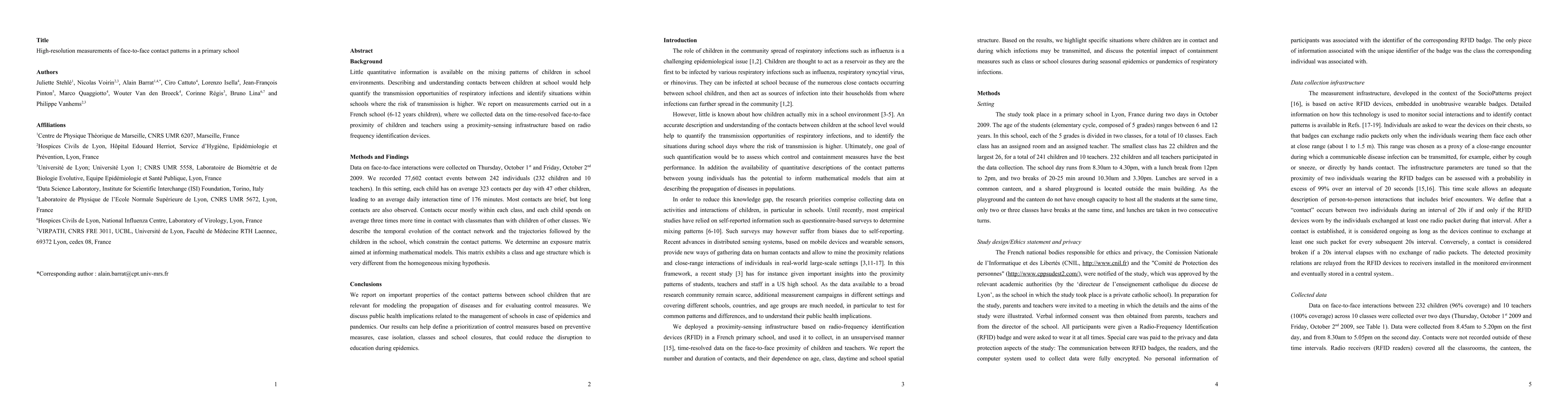 Researchers studied face-to-face contact patterns among 242 school children in France, finding that most contacts occur within each class and that long contacts are common. Their data can help inform disease modeling and public health strategies to control the spread of illnesses in schools.