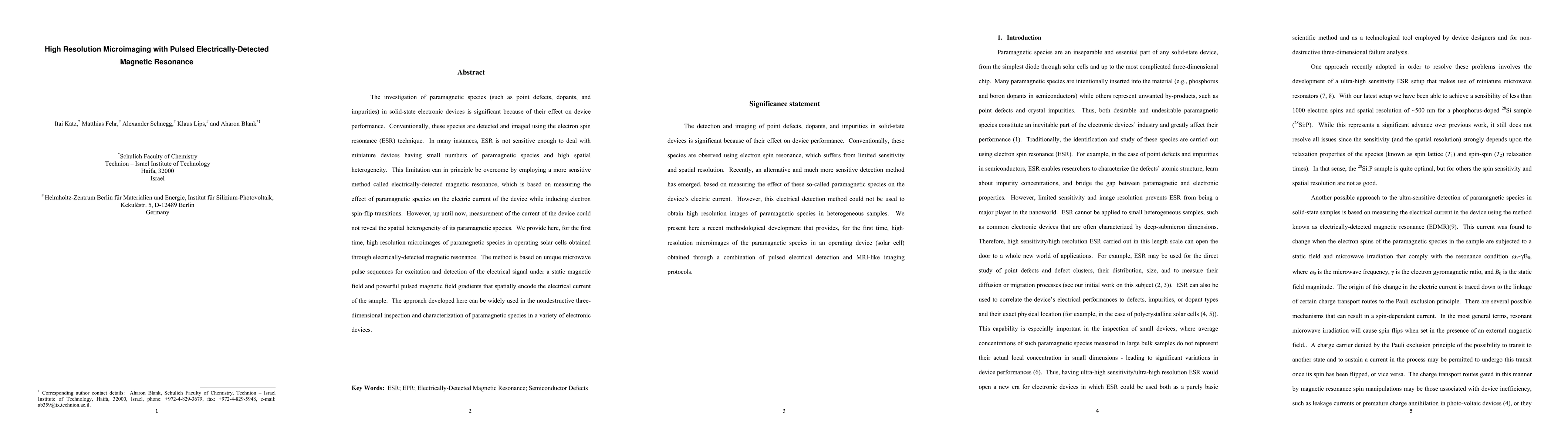 This paper introduces a novel method for high-resolution microimaging of paramagnetic species in solid-state electronic devices using electrically-detected magnetic resonance. The technique employs microwave pulse sequences and pulsed magnetic field gradients to overcome the limitations of conventional electron spin resonance, enabling nondestructive three-dimensional inspection of paramagnetic species in operating solar cells.