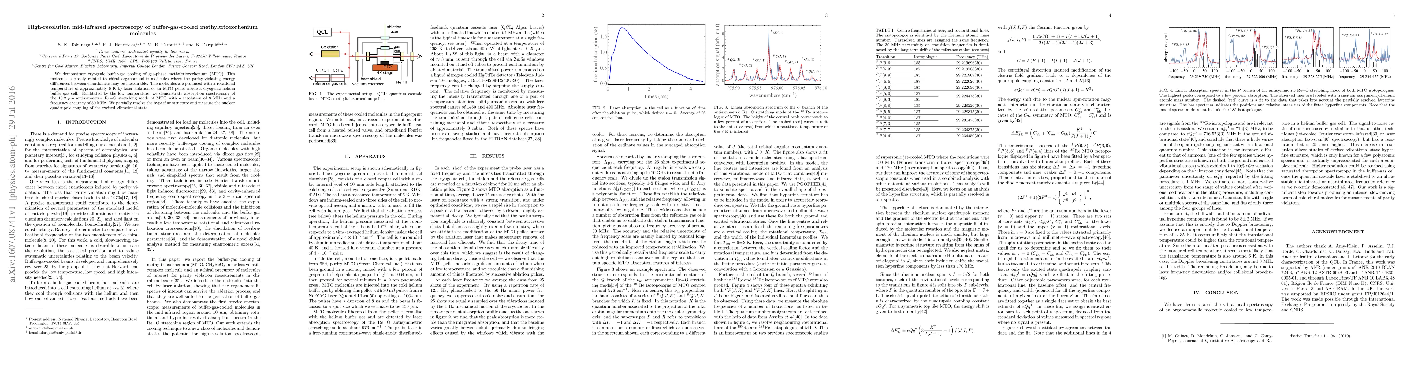 This paper demonstrates cryogenic buffer-gas cooling of methyltrioxorhenium (MTO) molecules, achieving low rotational temperatures, and employs high-resolution mid-infrared spectroscopy to analyze the antisymmetric Re=O stretching mode, resolving hyperfine structure and nuclear quadrupole coupling.