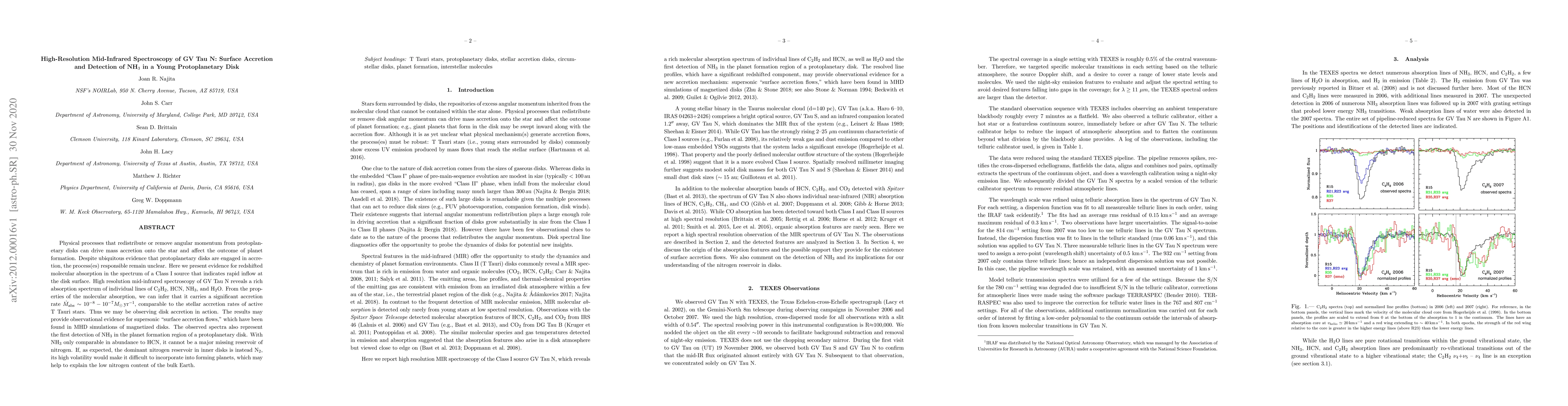 Physical processes that redistribute or remove angular momentum from protoplanetary disks can drive mass accretion onto the star and affect the outcome of planet formation. Despite ubiquitous evidence that protoplanetary disks are engaged in accretion, the process(es) responsible remain unclear. Here we present evidence for redshifted molecular absorption in the spectrum of a Class I source that indicates rapid inflow at the disk surface. High resolution mid-infrared spectroscopy of GV Tau N reveals a rich absorption spectrum of individual lines of C2H2, HCN, NH3, and water. From the properties of the molecular absorption, we can infer that it carries a significant accretion rate (~ 1e-8 to 1e-7 Msun/yr), comparable to the stellar accretion rates of active T Tauri stars. Thus we may be observing disk accretion in action. The results may provide observational evidence for supersonic "surface accretion flows," which have been found in MHD simulations of magnetized disks. The observed spectra also represent the first detection of ammonia in the planet formation region of a protoplanetary disk. With ammonia only comparable in abundance to HCN, it cannot be a major missing reservoir of nitrogen. If, as expected, the dominant nitrogen reservoir in inner disks is instead N2, its high volatility would make it difficult to incorporate into forming planets, which may help to explain the low nitrogen content of the bulk Earth.