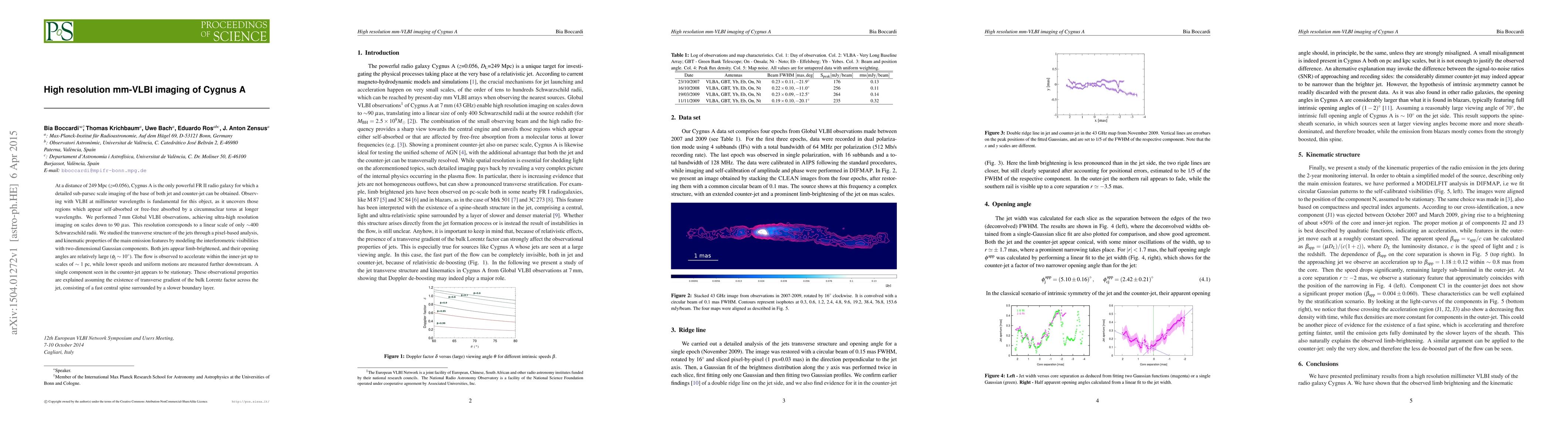 This study uses high-resolution millimeter-VLBI imaging to reveal detailed structures of Cygnus A's jets, showing limb-brightened jets with large opening angles and an accelerating flow within the inner jet. The observations suggest a central fast-moving spine surrounded by a slower boundary layer.