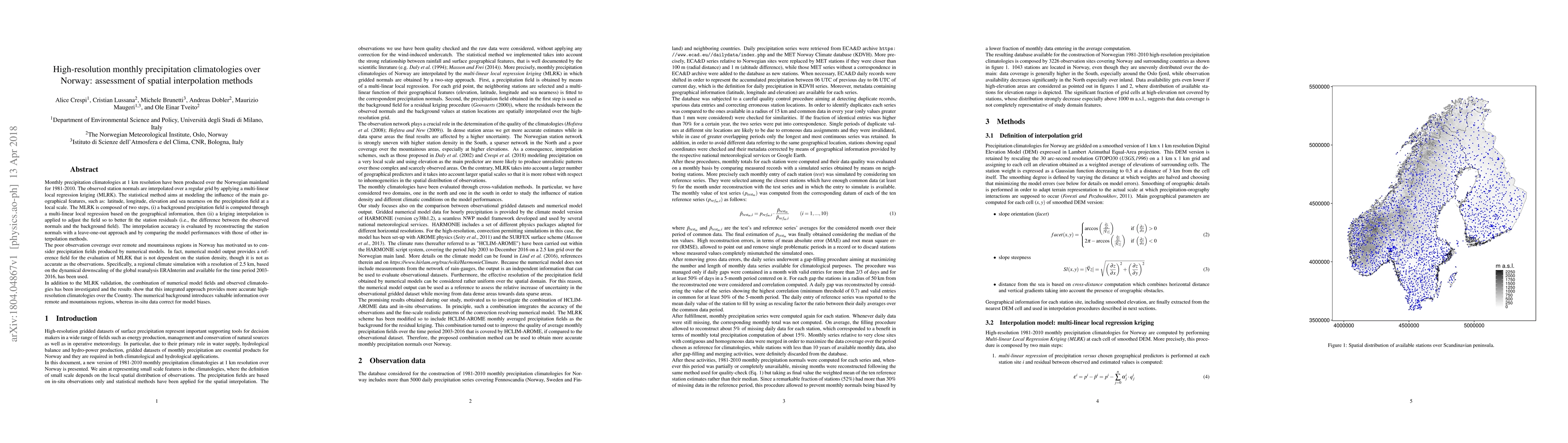 This study produces high-resolution monthly precipitation climatologies over Norway using multi-linear local regression kriging (MLRK) to interpolate observed station data. The study evaluates the accuracy of MLRK against other methods and finds that combining numerical model outputs with observed climatologies improves accuracy, especially in remote and mountainous areas.