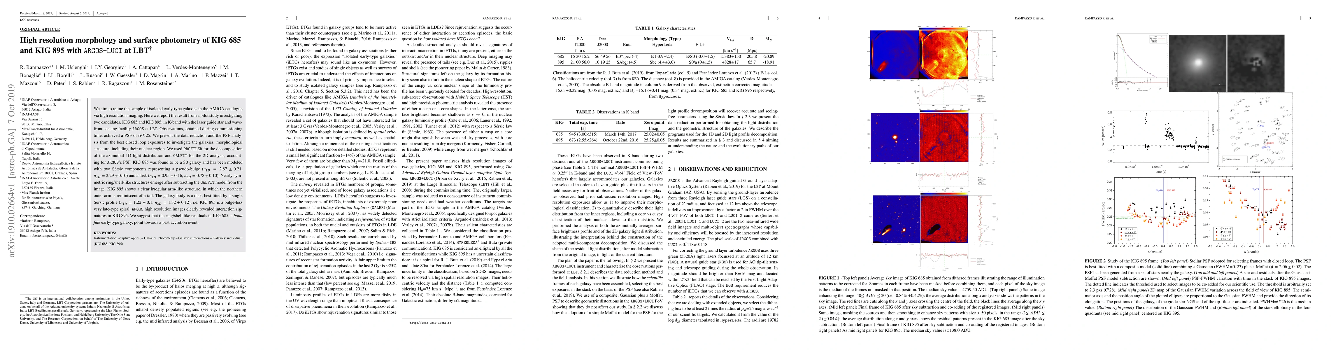 We aim to refine the sample of isolated early-type galaxies in the AMIGA catalogue via high resolution imaging. Here we report the result from a pilot study investigating two candidates, KIG 685 and KIG 895, in K-band with the laser guide star and wavefront sensing facility ARGOS} at LBT. Observations, obtained during commissioning time, achieved a PSF of ~0.25". We present the data reduction and the PSF analysis from the best closed loop exposures to investigate the galaxies' morphological structure, including their nuclear region. We used PROFILER for the decomposition of the azimuthal 1D light distribution and GALFIT for the 2D analysis, accounting for ARGOS's PSF. KIG 685 was found to be a S0 galaxy and has been modeled with two Sersic components representing a pseudo-bulge (n_{1D}=2.87+-0.21, n_{2D}=2.29+-0.10) and a disk (n_{1D}=0.95+-0.16, n_{2D}=0.78+-0.10). Nearly symmetric ring/shell-like structures emerge after subtracting the GALFIT model from the image. KIG 895 shows a clear irregular arm-like structure, in which the northern outer arm is reminiscent of a tail. The galaxy body is a disk, best fitted by a single Sersic profile (n_{1D}=1.22+-0.1; n_{2D}=1.32+-0.12), i.e. KIG 895 is a bulge-less very late-type spiral. ARGOS high resolution images clearly revealed interaction signatures in KIG 895. We suggest that the ring/shell like residuals in KIG 685, a "bona fide" early-type galaxy, point towards a past accretion event.