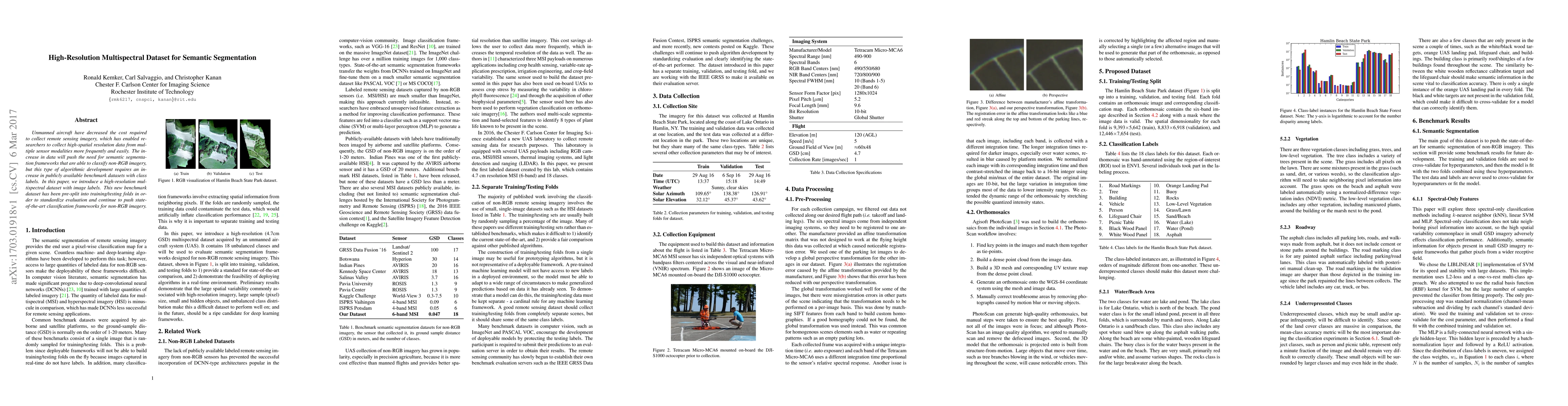 Unmanned aircraft have decreased the cost required to collect remote sensing imagery, which has enabled researchers to collect high-spatial resolution data from multiple sensor modalities more frequently and easily. The increase in data will push the need for semantic segmentation frameworks that are able to classify non-RGB imagery, but this type of algorithmic development requires an increase in publicly available benchmark datasets with class labels. In this paper, we introduce a high-resolution multispectral dataset with image labels. This new benchmark dataset has been pre-split into training/testing folds in order to standardize evaluation and continue to push state-of-the-art classification frameworks for non-RGB imagery.