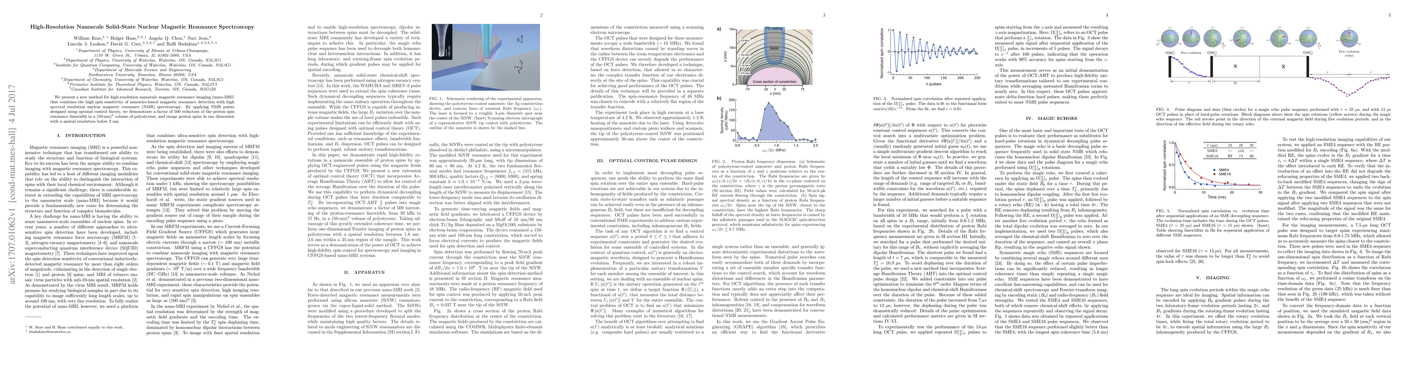 This paper introduces a new high-resolution nanoscale magnetic resonance imaging method that merges nanowire-based detection with high-resolution NMR spectroscopy, achieving a 500-fold reduction in proton spin resonance linewidth and enabling 1D imaging with a spatial resolution below 2 nm.