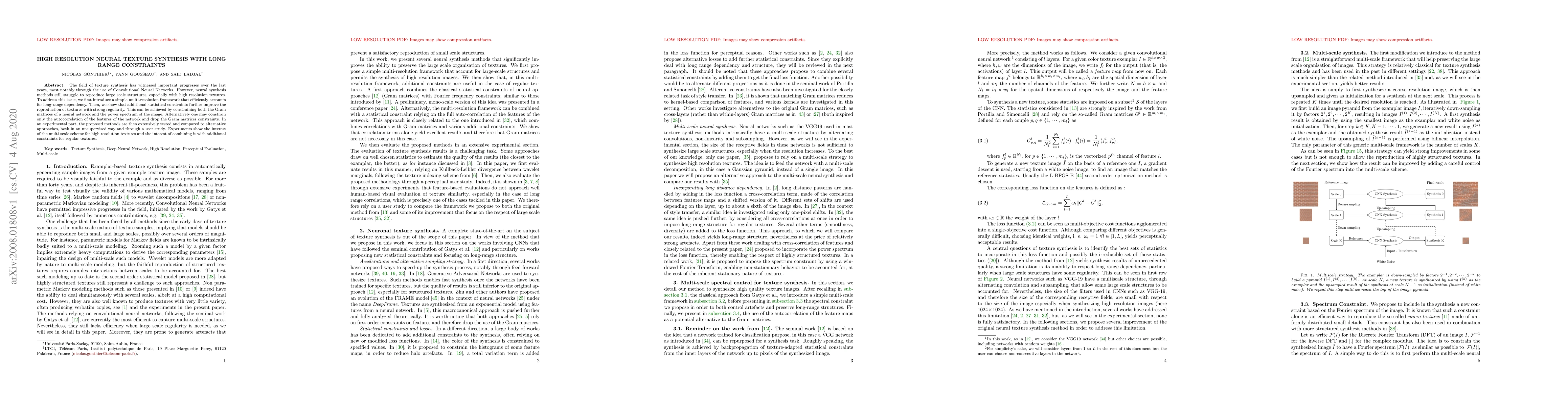 The field of texture synthesis has witnessed important progresses over the last years, most notably through the use of Convolutional Neural Networks. However, neural synthesis methods still struggle to reproduce large scale structures, especially with high resolution textures. To address this issue, we first introduce a simple multi-resolution framework that efficiently accounts for long-range dependency. Then, we show that additional statistical constraints further improve the reproduction of textures with strong regularity. This can be achieved by constraining both the Gram matrices of a neural network and the power spectrum of the image. Alternatively one may constrain only the autocorrelation of the features of the network and drop the Gram matrices constraints. In an experimental part, the proposed methods are then extensively tested and compared to alternative approaches, both in an unsupervised way and through a user study. Experiments show the interest of the multi-scale scheme for high resolution textures and the interest of combining it with additional constraints for regular textures.