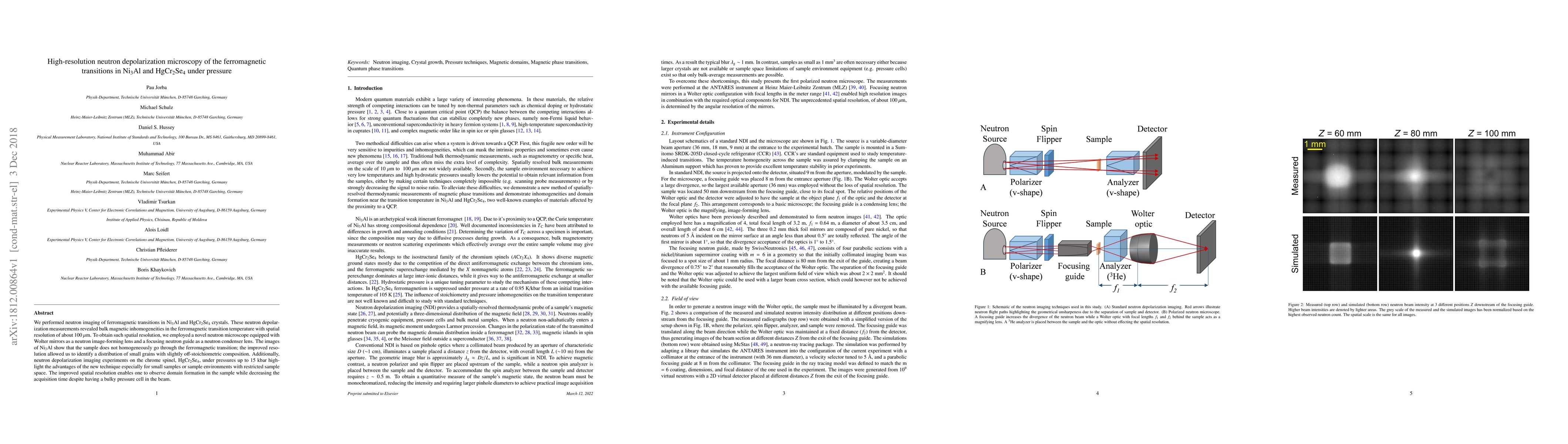 The research presents a novel neutron microscopy technique with 100u03bcm resolution, revealing magnetic inhomogeneities in Ni3Al's ferromagnetic transition and domain formation in HgCr2Se4 under pressure. This method, using Wolter mirrors and a neutron condenser lens, is beneficial for small samples or restricted sample spaces.