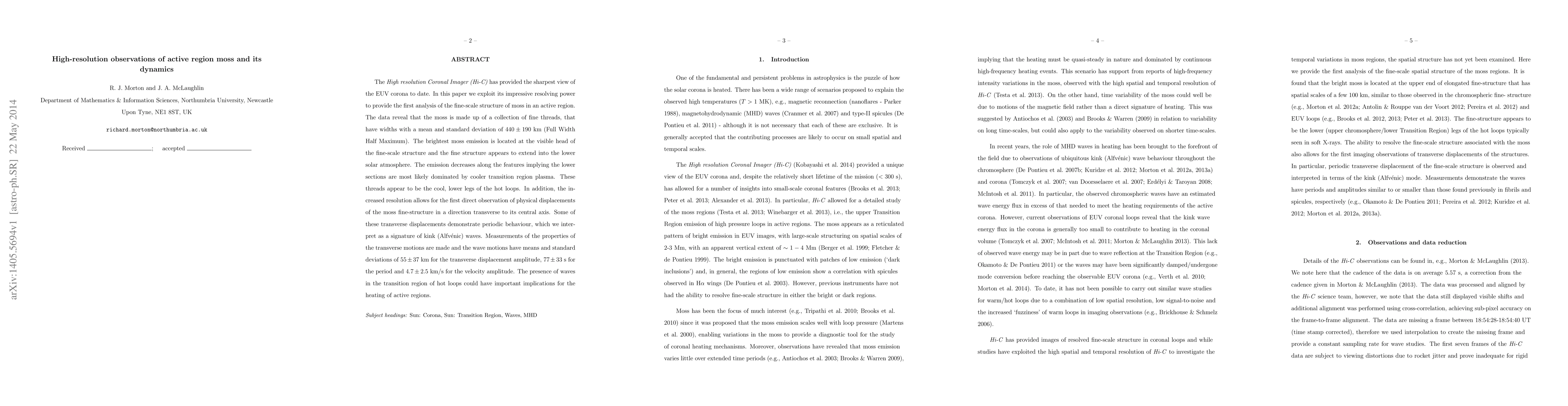This paper uses the High resolution Coronal Imager (Hi-C) to analyze the fine-scale structure of moss in an active region, revealing fine threads with widths averaging 440 km. The study observes periodic transverse displacements interpreted as kink (Alfvénic) waves, which may impact the heating of active regions.