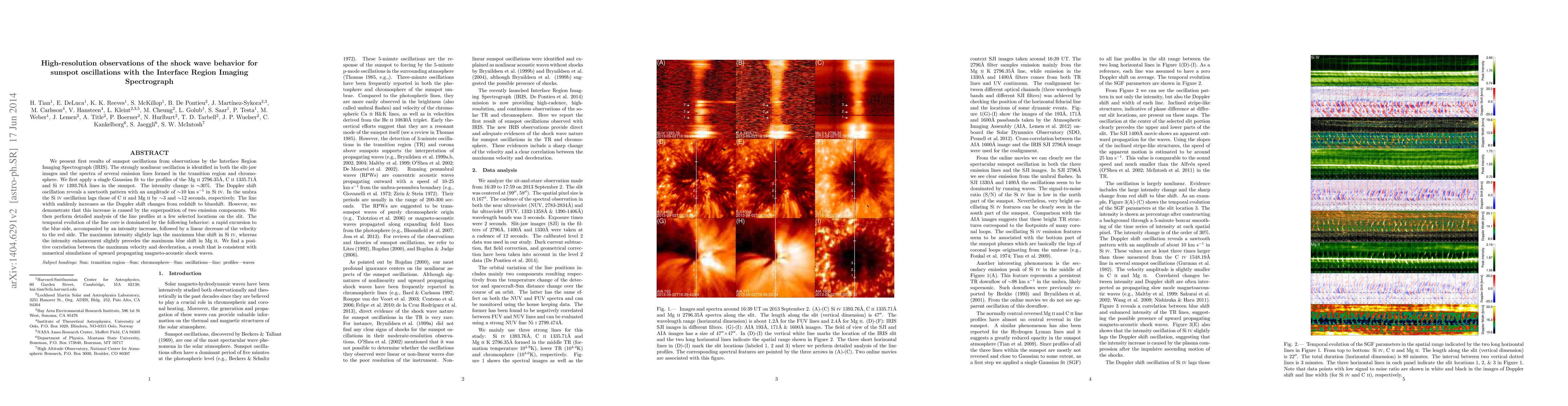 The paper presents the first observations of sunspot oscillations using the Interface Region Imaging Spectrograph, identifying a strongly nonlinear oscillation in various emission lines. Key findings include a sawtooth Doppler shift pattern, intensity changes, and phase lags in different spectral lines. The study reveals a correlation between maximum velocity and deceleration, consistent with numerical simulations of magnetoacoustic shock waves.