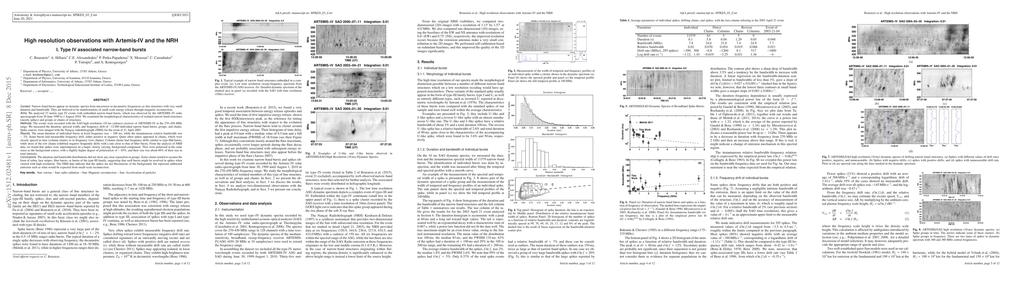 Narrow band bursts appear on dynamic spectra from microwave to decametric frequencies as fine structures with very small duration and bandwidth. They are thought to mark small scale magnetic reconnection. We analyzed 27 metric type-IV events with narrow band bursts observed by the ARTEMIS-IV radiospectrograph in 30/6/1999-1/8/2010. We examined the morphological characteristics of isolated narrow-band bursts and groups or chains of spikes. The events were recorded with the SAO (10 ms cadence) receiver of ARTEMIS-IV in the 270-450 MHz range. We measured the duration, spectral width, and frequency drift of ~12000 individual narrow-band bursts, groups, and chains. Spike sources were imaged with the NRH for the event of 21 April 2003. The mean duration of individual bursts at fixed frequency was ~100 ms, while the instantaneous relative bandwidth was ~2%. Some bursts had measurable frequency drift, positive or negative. Often spikes appeared in chains, which were closely spaced in time (column chains) or in frequency (row chains). Column chains had frequency drifts similar to IIId-bursts; most of the row chains exhibited negative drifts similar to fiber bursts. From the NRH data, we found that spikes were superimposed on a larger, slowly varying, background component. They were polarized in the same sense as the background source, with a slightly higher degree of polarization of ~65%, and their size was ~60% of their size in total intensity. The duration and bandwidth distributions did not show any clear separation in groups. Some chains tended to assume the form of zebra, lace stripes, fibers, or bursts of the type-III family, suggesting that such bursts might be resolved in spikes when viewed with high resolution. The NRH data indicate that the spikes are not fluctuations of the background, but represent additional emission such as what would be expected from small-scale reconnection.