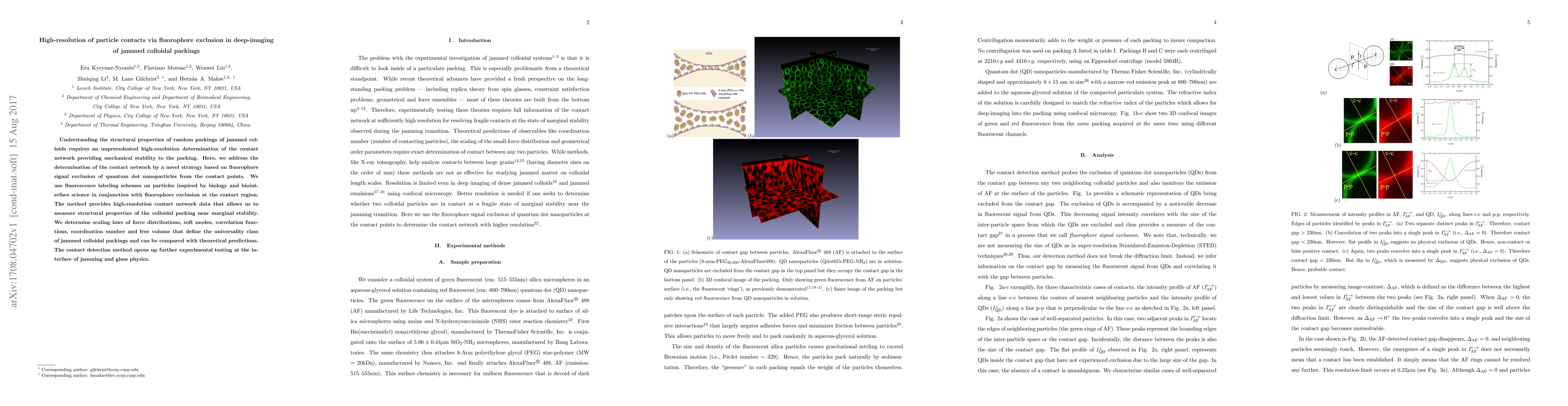 This paper introduces a novel high-resolution method for determining the contact network in jammed colloidal packings using fluorophore exclusion from quantum dot nanoparticles. The technique reveals structural properties near marginal stability, enabling the determination of scaling laws and universality classes comparable to theoretical predictions.