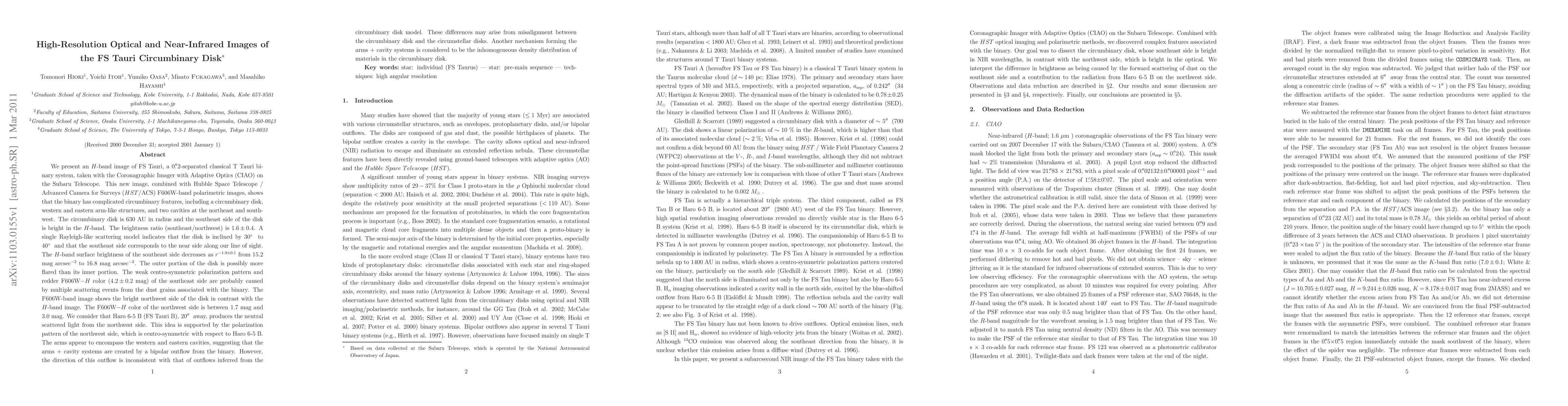 We present an H-band image of FS Tauri, a 0.2"-separated classical T Tauri binary system, taken with the Coronagraphic Imager with Adaptive Optics on the Subaru Telescope. This new image, combined with Hubble Space Telescope / Advanced Camera for Surveys F606W-band polarimetric images, shows that the binary has complicated circumbinary features, including a circumbinary disk, western and eastern arm-like structures, and two cavities at the northeast and southwest. The circumbinary disk is 630 AU in radius and the southeast side of the disk is bright in the H-band. The brightness ratio (southeast/northwest) is 1.6. A single Rayleigh-like scattering model indicates that the disk is inclined by 30 degree to 40 degree and that the southeast side corresponds to the near side along our line of sight. The H-band surface brightness of the southeast side decreases as r^(-1.9) from 15.2 mag arcsec^-2 to 16.8 mag arcsec^-2. The outer portion of the disk is possibly more flared than its inner portion. The weak centro-symmetric polarization pattern and redder F606W-H color (4.2 mag) of the southeast side are probably caused by multiple scattering events from the dust grains associated with the binary. The F606W-band image shows the bright northwest side of the disk in contrast with the H-band image. The F606W-H color of the northwest side is between 1.7 mag and 3.0 mag. We consider that Haro 6-5 B (FS Tauri B), 20" away, produces the neutral scattered light from the northwest side. This idea is supported by the polarization pattern of the northwest side, which is centro-symmetric with respect to Haro 6-5 B. The arms appear to encompass the western and eastern cavities, suggesting that the arms + cavity systems are created by a bipolar outflow from the binary. However, the direction of this outflow is inconsistent with that of outflows inferred from the circumbinary disk model.