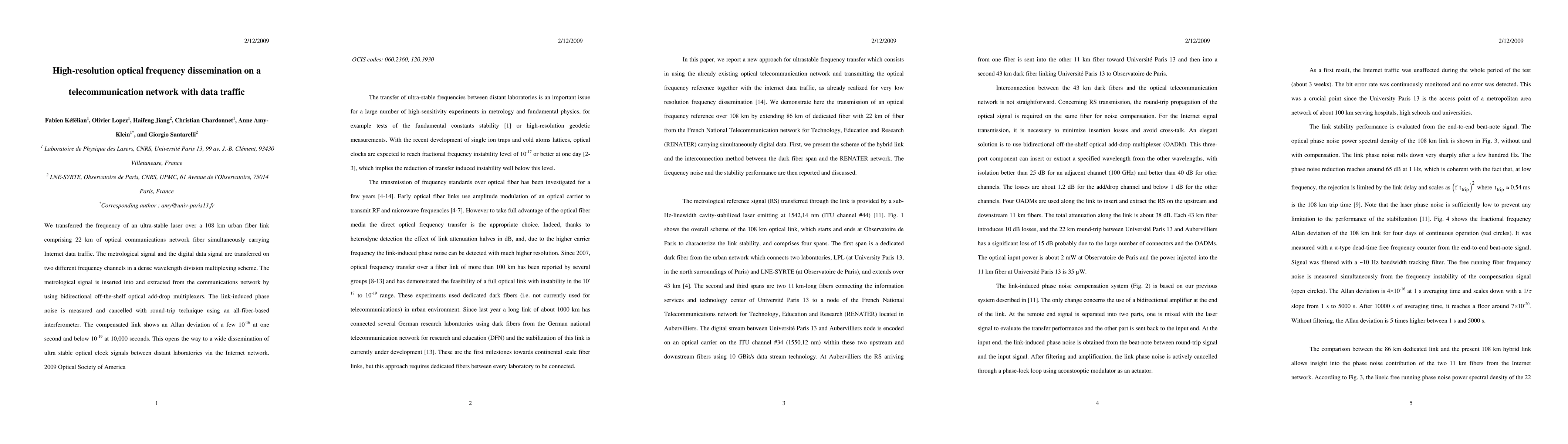 This paper demonstrates the transfer of an ultra-stable laser frequency over a 108 km fiber link shared with Internet data traffic, achieving high-resolution optical frequency dissemination using dense wavelength division multiplexing and advanced noise cancellation techniques. The method promises widespread dissemination of stable optical clock signals over telecommunication networks.