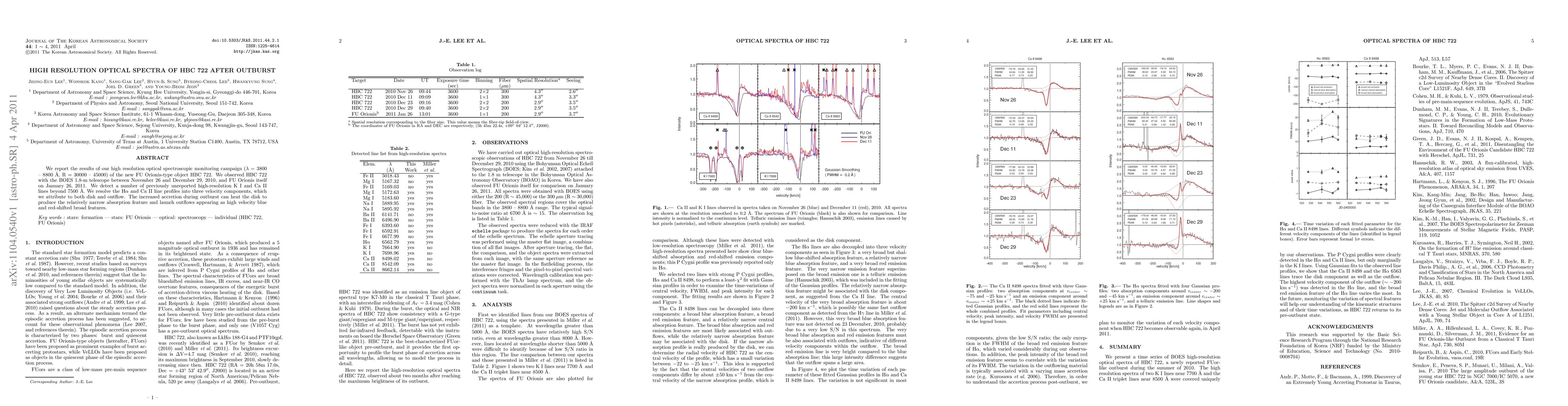 We report the results of our high resolution optical spectroscopic monitoring campaign ($\lambda$ = 3800 -- 8800 A, R = 30000 -- 45000) of the new FU Orionis-type object HBC 722. We observed HBC 722 with the BOES 1.8-m telescope between 2010 November 26 and 2010 December 29 and FU Orionis itself on 2011 January 26. We detect a number of previously unreported high-resolution K I and Ca II lines beyond 7500 A. We resolve the H$\alpha$ and Ca II line profiles into three velocity components, which we attribute to both disk and outflow. The increased accretion during outburst can heat the disk to produce the relatively narrow absorption feature and launch outflows appearing as high velocity blue and redshifted broad features.
