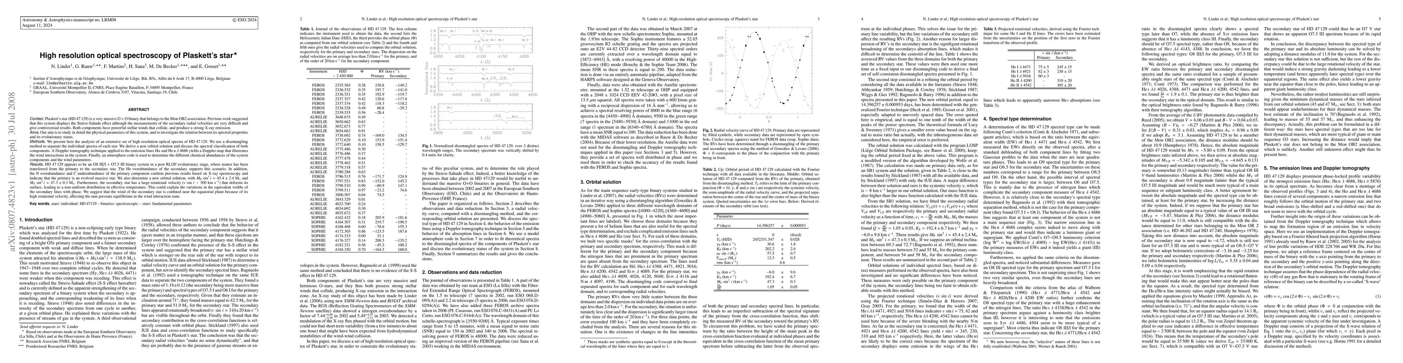 We present here the analysis of an extensive set of high resolution optical spectra of Plaskett's star (HD 47129). We use a disentangling method to separate the individual spectra of each star. We derive a new orbital solution and discuss the spectral classification of both components. A Doppler tomography technique applied to the emission lines H alpha and He II 4686 yields a Doppler map that illustrates the wind interactions in the system. Finally, an atmosphere code is used to determine the different chemical abundances of the system components and the wind parameters. HD 47129 appears to be an O8 III/I + O7.5 III binary system in a post RLOF evolutionary stage, where matter has been transferred from the primary to the secondary star. The He overabundance of the secondary supports this scenario. In addition, the N overabundance and C underabundance of the primary component confirm previous results based on X-ray spectroscopy and indicate that the primary is an evolved massive star. Furthermore, the secondary star has a large rotational velocity that deforms its surface, leading to a non-uniform distribution in effective temperature. This could explain the variations in the equivalent widths of the secondary lines with phase. We suggest that the wind of the secondary star is confined near the equatorial plane because of its high rotational velocity, affecting the ram pressure equilibrium in the wind interaction zone.