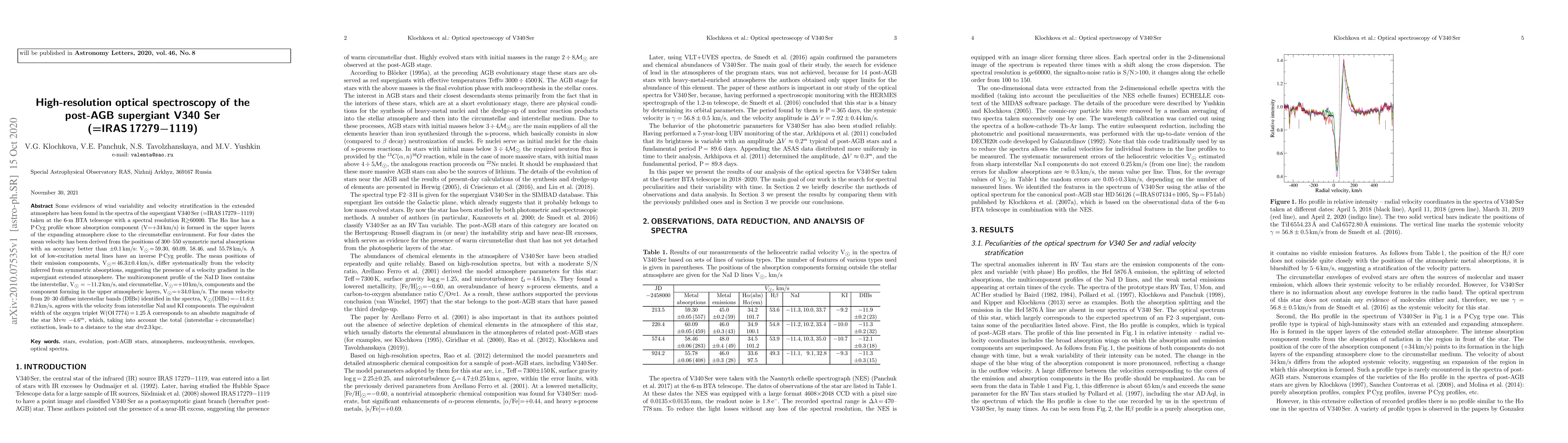 Some evidences of wind variability and velocity stratification in the extended atmosphere has been found in the spectra of the supergiant V340 Ser (=IRAS 17279$-$1119) taken at the 6-m BTA telescope with a spectral resolution R$\ge$60000. The H$\alpha$ line has a P Cyg profile whose absorption component (V=+34 km/s) is formed in the upper layers of the expanding atmosphere close to the circumstellar environment. For four dates the mean velocity has been derived from the positions of 300-550 symmetric metal absorptions with an accuracy better than $\pm0.1$ km/s: Vr=59.30, 60.09, 58.46, and 55.78 km/s. A lot of low-excitation metal lines have an inverse P Cyg profile. The mean positions of their emission components, Vr=46.3$\pm$0.4 km/s, differ systematically from the velocity inferred from symmetric absorptions, suggesting the presence of a velocity gradient in the supergiant extended atmosphere. The multicomponent profile of the NaI D-lines contains the interstellar, Vr=-11.2 km/s, and circumstellar, Vr=+10 km/s, components and the component forming in the upper atmospheric layers, Vr=+34.0 km/s. The mean velocity from 20-30 diffuse interstellar bands (DIBs) identified in the spectra, Vr(DIBs)=-11.6$\pm0.2$ km/s, agrees with the velocity from interstellar NaI and KI components. The equivalent width of the oxygen triplet W(7774)=1.25 A corresponds to an absolute magnitude of the star Mv$\approx-4.6^m$, which, taking into account the total (interstellar+circumstellar) extinction, leads to a distance to the star d$\approx$2.3 kpc.