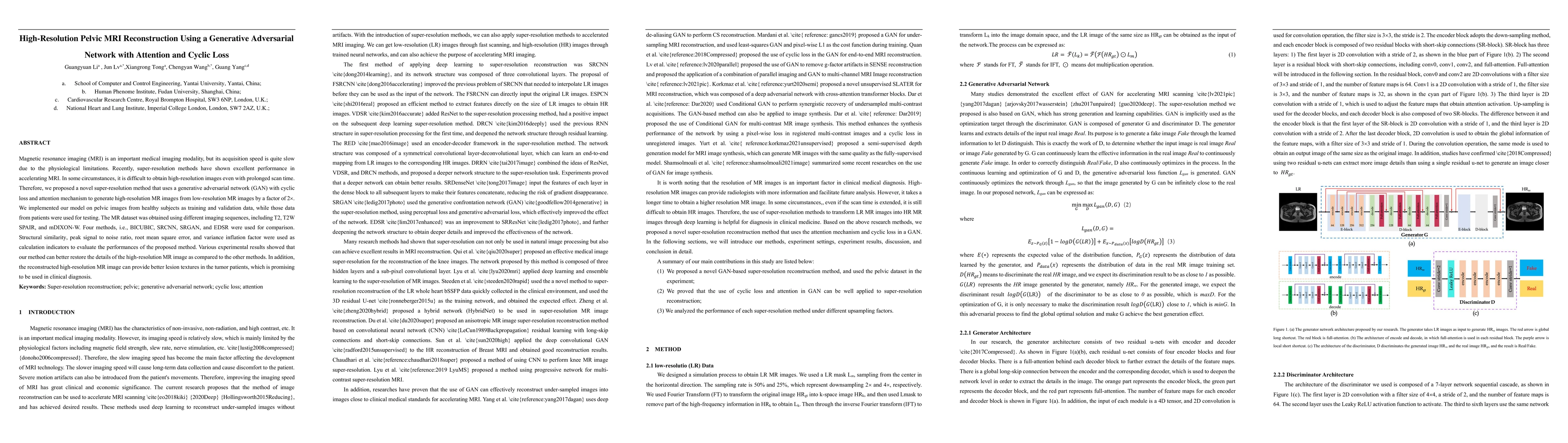 This paper proposes a novel super-resolution method using a generative adversarial network (GAN) with cyclic loss and attention mechanism to generate high-resolution pelvic MRI images from low-resolution scans. Experimental results show superior performance compared to other methods, indicating potential clinical utility in improving lesion texture visibility for diagnosis.