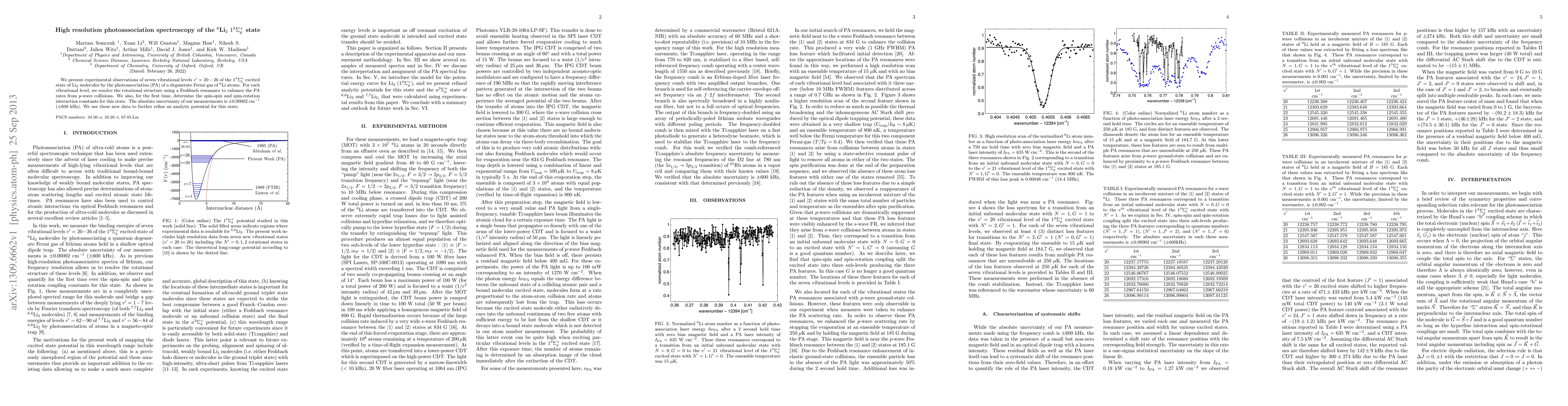 We present experimental observations of seven vibrational levels $v'=20-26$ of the $1^{3}\Sigma_{g}^{+}$ excited state of Li$_2$ molecules by the photoassociation (PA) of a degenerate Fermi gas of $^6$Li atoms. For each vibrational level, we resolve the rotational structure using a Feshbach resonance to enhance the PA rates from p-wave collisions. We also, for the first time, determine the spin-spin and spin-rotation interaction constants for this state. The absolute uncertainty of our measurements is $\pm 0.00002$ cm$^{-1}$ ($\pm 600$ kHz). We use these new data to further refine an analytic potential for this state.