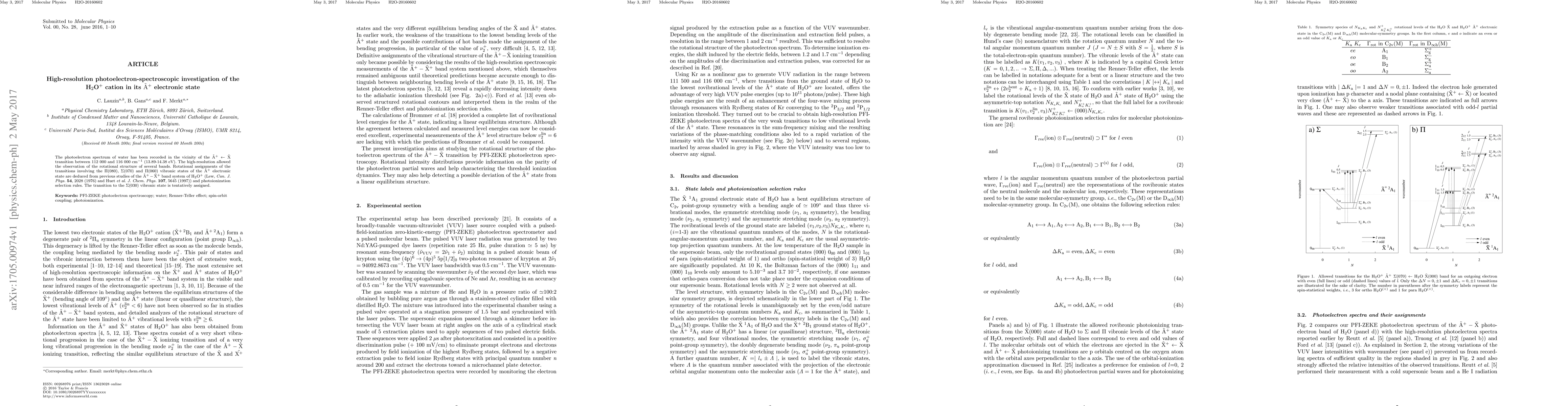 The paper presents a high-resolution photoelectron spectrum study of the H2O+ cation in its A^+ electronic state, identifying rotational structures of several bands. Assignments of transitions involving Pi(080), Sigma(070), and Pi(060) vibronic states of the A^+ state are deduced from previous studies and selection rules. The transition to the Sigma(030) vibronic state is tentatively assigned.