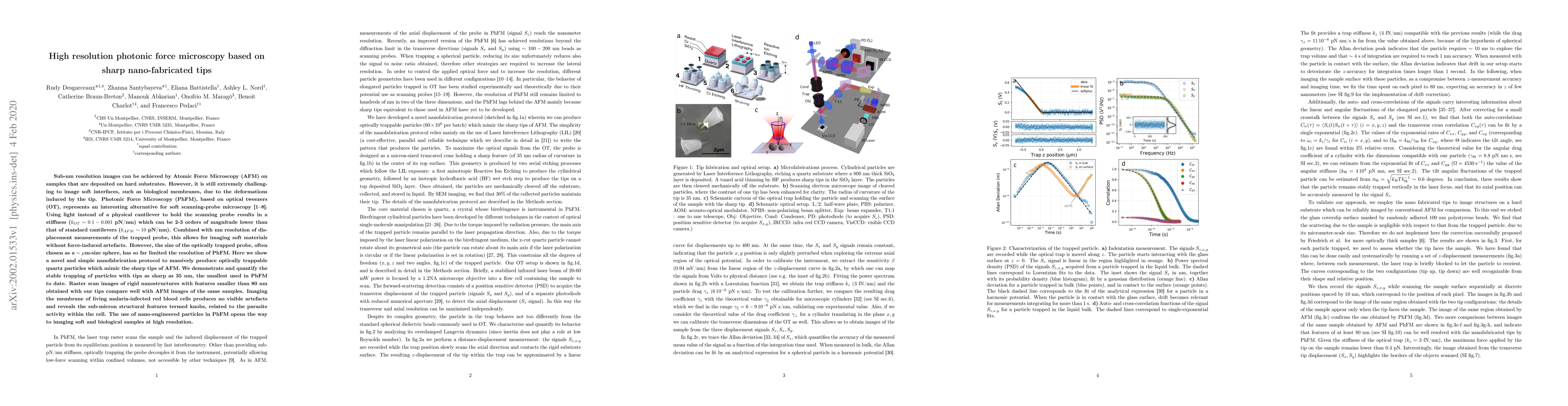 This paper presents a novel nanofabrication technique to produce sharp nano-engineered tips for Photonic Force Microscopy (PhFM), achieving sub-nm resolution. The new method enables the trapping of quartz particles with tips as sharp as 35 nm, significantly improving the resolution over previous $\mu$m-sized spheres, allowing for high-fidelity imaging of soft biological interfaces without artefacts.