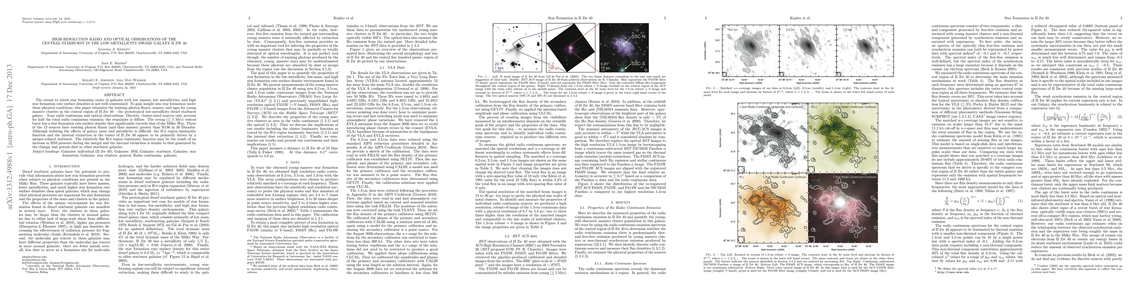 The extent to which star formation varies in galaxies with low masses, low metallicities, and high star formation rate surface densities is not well-constrained. To gain insight into star formation under these physical conditions, this paper estimates the ionizing photon fluxes, masses, and ages for young massive clusters in the central region of II Zw 40 -- the prototypical low-metallicity dwarf starburst galaxy -- from radio continuum and optical observations. Discrete, cluster-sized sources only account for half the total radio continuum emission; the remainder is diffuse. The young (<5 Myr) central burst has a star formation rate surface density that significantly exceeds that of the Milky Way. Three of the 13 sources have ionizing photon fluxes (and thus masses) greater than R136 in 30 Doradus. Although isolating the effects of galaxy mass and metallicity is difficult, the HII region luminosity function and the internal extinction in the center of II Zw 40 appear to be primarily driven by a merger-related starburst. The relatively flat HII region luminosity function may be the result of an increase in ISM pressure during the merger and the internal extinction is similar to that generated by the clumpy and porous dust in other starburst galaxies.