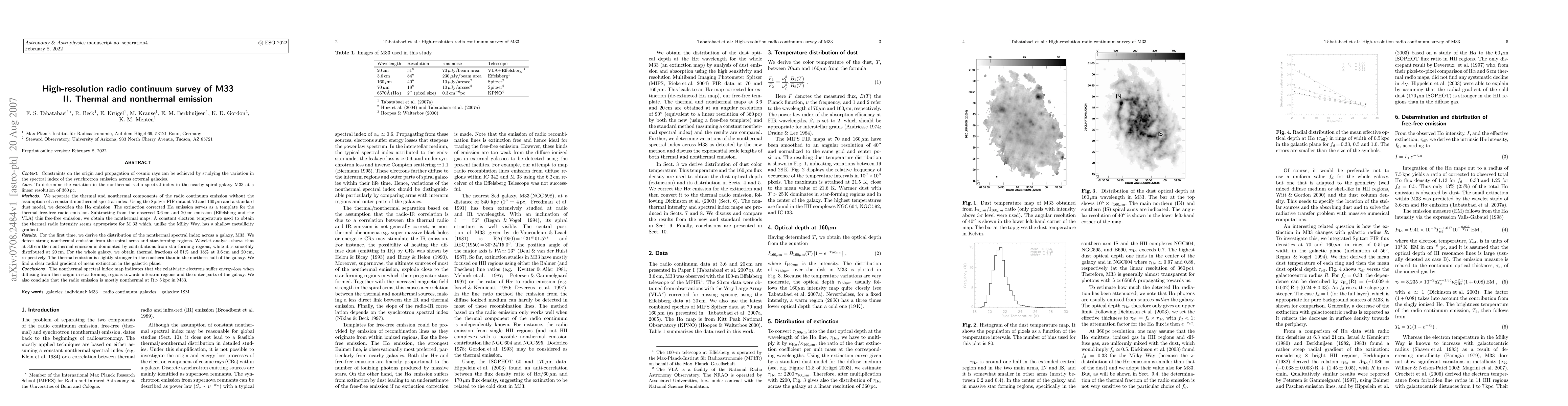 This study provides high-resolution maps of thermal and nonthermal radio emission in M33, revealing a radial gradient in extinction and nonthermal spectral index. The nonthermal emission is prominent in star-forming regions, while thermal emission is slightly stronger in the southern half of the galaxy.
