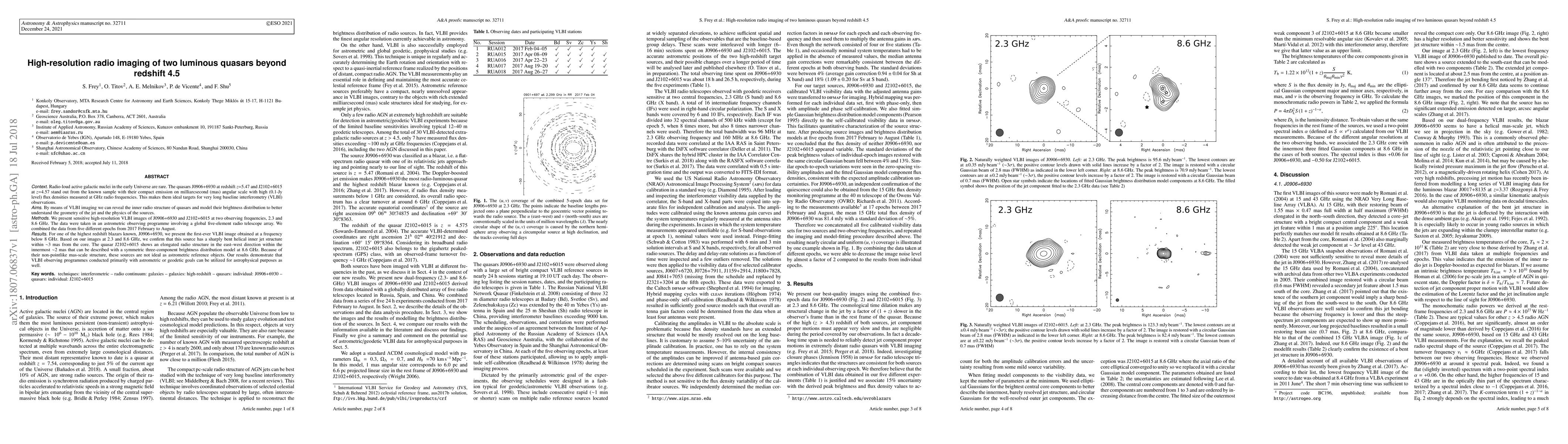 Context. Radio-loud active galactic nuclei in the early Universe are rare. The quasars J0906+6930 at redshift z=5.47 and J2102+6015 at z=4.57 stand out from the known sample with their compact emission on milliarcsecond (mas) angular scale with high (0.1-Jy level) flux densities measured at GHz radio frequencies. This makes them ideal targets for very long baseline interferometry (VLBI) observations. Aims. By means of VLBI imaging we can reveal the inner radio structure of quasars and model their brightness distribution to better understand the geometry of the jet and the physics of the sources. Methods. We present sensitive high-resolution VLBI images of J0906+6930 and J2102+6015 at two observing frequencies, 2.3 and 8.6 GHz. The data were taken in an astrometric observing programme involving a global five-element radio telescope array. We combined the data from five different epochs from 2017 February to August. Results. For one of the highest redshift blazars known, J0906+6930, we present the first-ever VLBI image obtained at a frequency below 8 GHz. Based on our images at 2.3 and 8.6 GHz, we confirm that this source has a sharply bent helical inner jet structure within ~3 mas from the core. The quasar J2102+6015 shows an elongated radio structure in the east-west direction within the innermost ~2 mas that can be described with a symmetric three-component brightness distribution model at 8.6 GHz. Because of their non-pointlike mas-scale structure, these sources are not ideal as astrometric reference objects. Our results demonstrate that VLBI observing programmes conducted primarily with astrometric or geodetic goals can be utilized for astrophysical purposes as well.