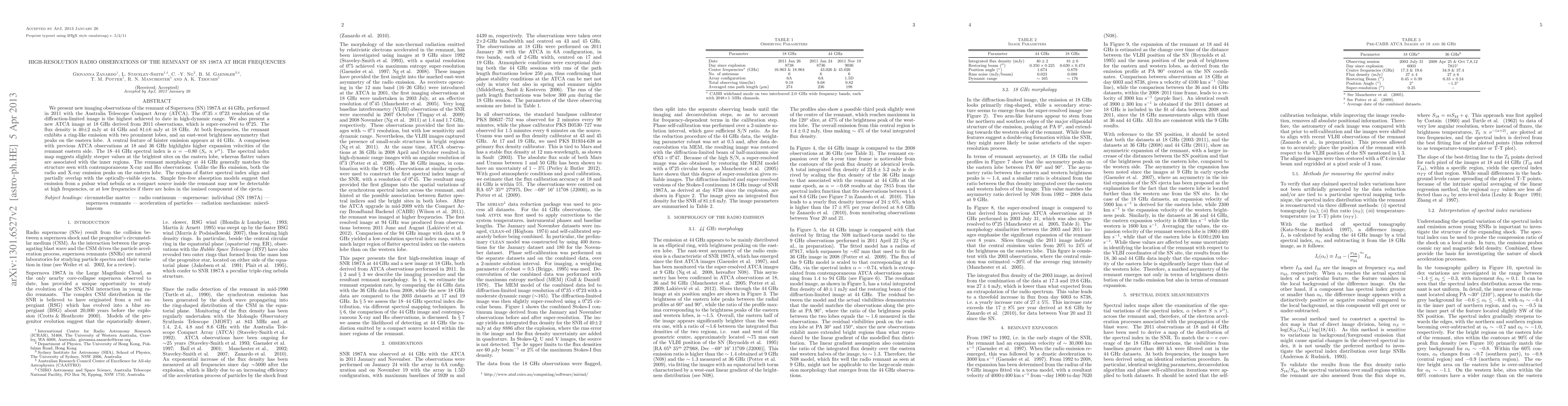 This paper reports high-resolution radio observations of the Supernova 1987A remnant at 44 GHz and 18 GHz, revealing a ring-like structure with an east-west brightness asymmetry and suggesting higher expansion velocities on the eastern side. The spectral index indicates potential detectability of a pulsar wind nebula or compact source.