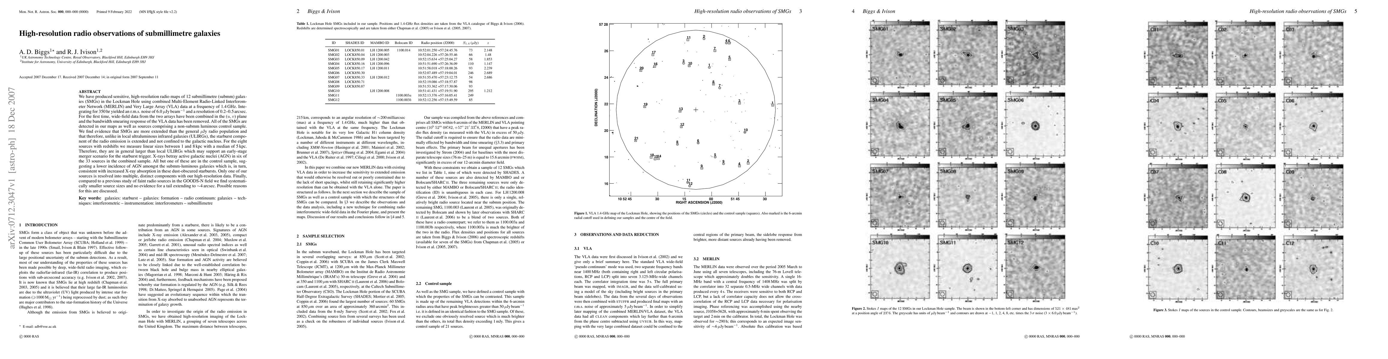 We have produced sensitive, high-resolution radio maps of 12 SMGs in the Lockman Hole using combined MERLIN and VLA data at a frequency of 1.4 GHz. Integrating for 350hr yielded an r.m.s. noise of 6.0 uJy/beam and a resolution of 0.2-0.5". For the first time, wide-field data from the two arrays have been combined in the (u,v) plane and the bandwidth smearing response of the VLA data has been removed. All of the SMGs are detected in our maps as well as sources comprising a non-submm luminous control sample. We find evidence that SMGs are more extended than the general uJy radio population and that therefore, unlike in local ULIRGs, the starburst component of the radio emission is extended and not confined to the galactic nucleus. For the eight sources with redshifts we measure linear sizes between 1 and 8 kpc with a median of 5 kpc. Therefore, they are in general larger than local ULIRGs which may support an early-stage merger scenario for the starburst trigger. X-rays betray AGN in six of the 33 sources in the combined sample. All but one of these are in the control sample, suggesting a lower incidence of AGN amongst the submm-luminous galaxies which is, in turn, consistent with increased X-ray absorption in these dust-obscured starbursts. Only one of our sources is resolved into multiple, distinct components with our high-resolution data. Finally, compared to a previous study of faint radio sources in the GOODS-N field we find systematically smaller source sizes and no evidence for a tail extending to ~4". Possible reasons for this are discussed.