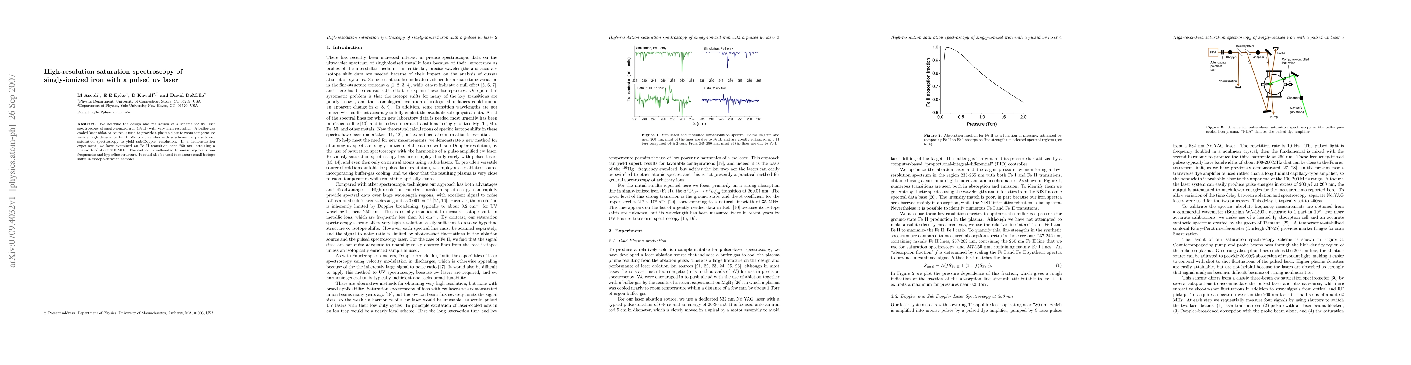 This paper details a high-resolution UV laser spectroscopy technique for singly-ionized iron (Fe II) using pulsed UV laser saturation spectroscopy, achieving a linewidth of about 250 MHz. The method employs a buffer-gas cooled laser ablation source to produce a room-temperature plasma with high Fe II density, suitable for precise transition frequency and hyperfine structure measurements.