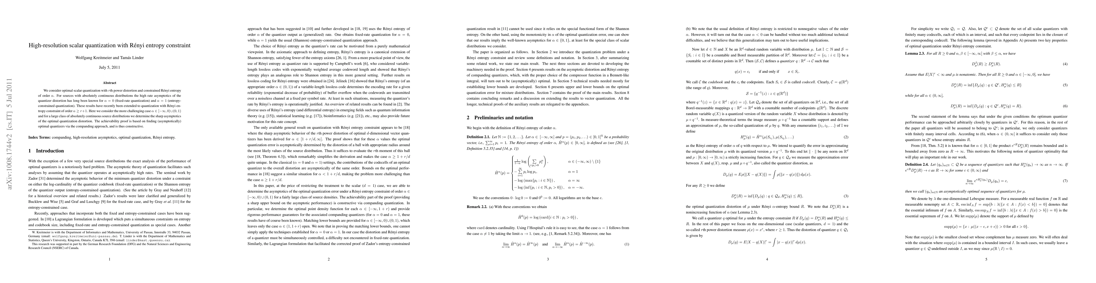 The paper presents a comprehensive proof for the high-rate asymptotics of optimal scalar quantization distortion under Rényi entropy constraints for a broad range of α values, extending previous work.