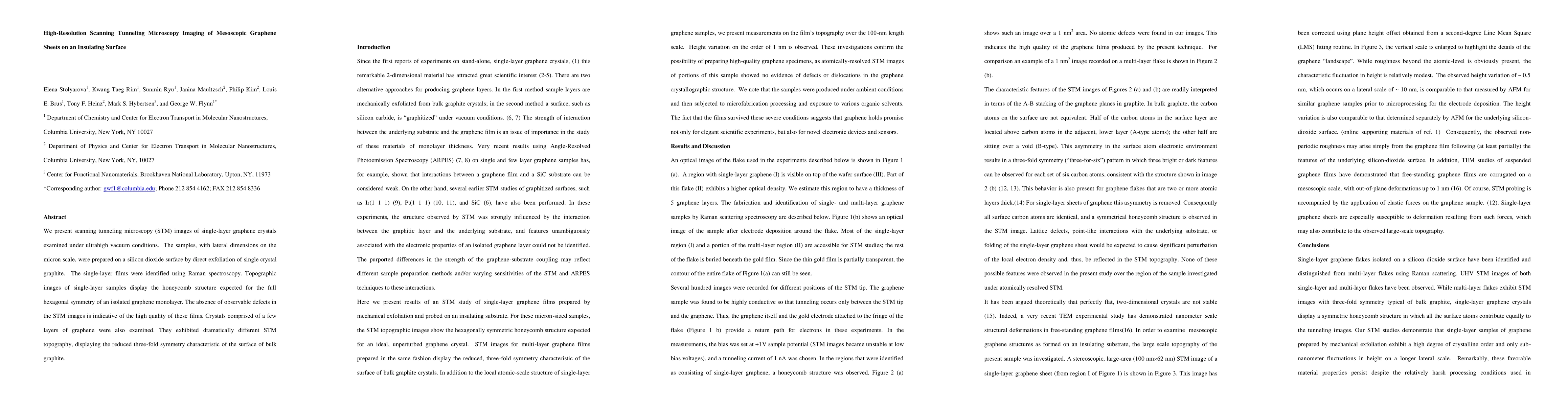 This paper presents high-resolution scanning tunneling microscopy (STM) images of mesoscopic graphene sheets on a silicon dioxide surface, revealing the honeycomb structure with no observable defects, indicating high-quality single-layer graphene. Multi-layer graphene samples showed a different STM topography with reduced symmetry typical of bulk graphite.