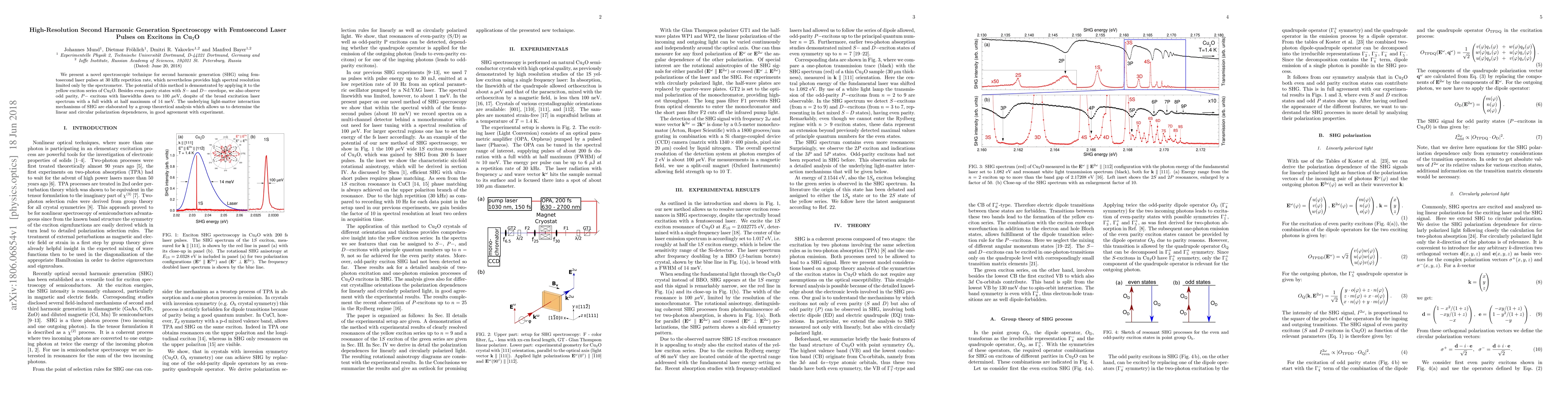 We present a novel spectroscopic technique for second harmonic generation (SHG) using femtosecond laser pulses at 30~kHz repetition rate, which nevertheless provides high spectral resolution limited only by the spectrometer. The potential of this method is demonstrated by applying it to the yellow exciton series of Cu$_2$O. Besides even parity states with $S-$ and $D-$ envelope, we also observe odd parity, $P-$ excitons with linewidths down to 100 $\mu$eV, despite of the broad excitation laser spectrum with a full width at half maximum of 14~meV. The underlying light-matter interaction mechanisms of SHG are elaborated by a group theoretical analysis which allows us to determine the linear and circular polarization dependences, in good agreement with experiment.