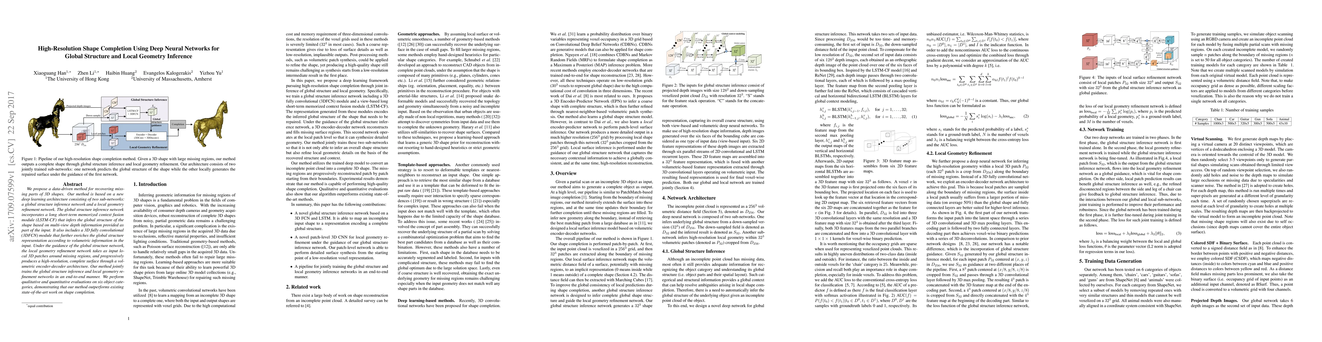 We propose a data-driven method for recovering miss-ing parts of 3D shapes. Our method is based on a new deep learning architecture consisting of two sub-networks: a global structure inference network and a local geometry refinement network. The global structure inference network incorporates a long short-term memorized context fusion module (LSTM-CF) that infers the global structure of the shape based on multi-view depth information provided as part of the input. It also includes a 3D fully convolutional (3DFCN) module that further enriches the global structure representation according to volumetric information in the input. Under the guidance of the global structure network, the local geometry refinement network takes as input lo-cal 3D patches around missing regions, and progressively produces a high-resolution, complete surface through a volumetric encoder-decoder architecture. Our method jointly trains the global structure inference and local geometry refinement networks in an end-to-end manner. We perform qualitative and quantitative evaluations on six object categories, demonstrating that our method outperforms existing state-of-the-art work on shape completion.