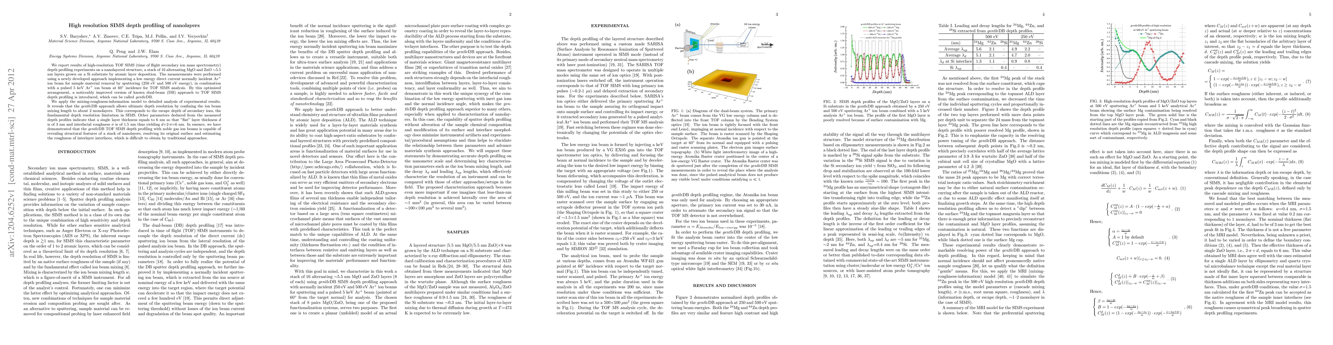 This paper presents high-resolution TOF SIMS depth profiling of a nanolayered structure composed of alternating MgO and ZnO layers using a novel gentleDB approach. The method achieves ultimate depth resolution by confining ion beam mixing to 2 monolayers, revealing layer thicknesses and interfacial roughness.