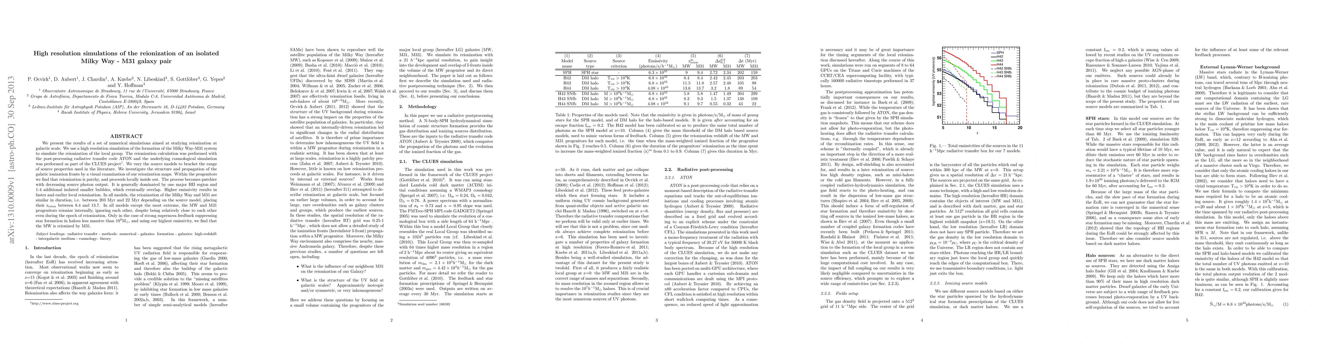 The paper presents high-resolution simulations of the reionization of an isolated Milky Way-M31 galaxy pair. Key findings include patchy reionization proceeding locally inside out, dominated by one major HII region and smaller bubbles. Reionization duration is similar for both galaxies, between 203-22 Myr, with zreion between 8.4-13.7. Interestingly, in most models, galaxies reionize independently despite proximity. Only with strong supernova feedback and high emissivity, M31 reionizes the Milky Way.