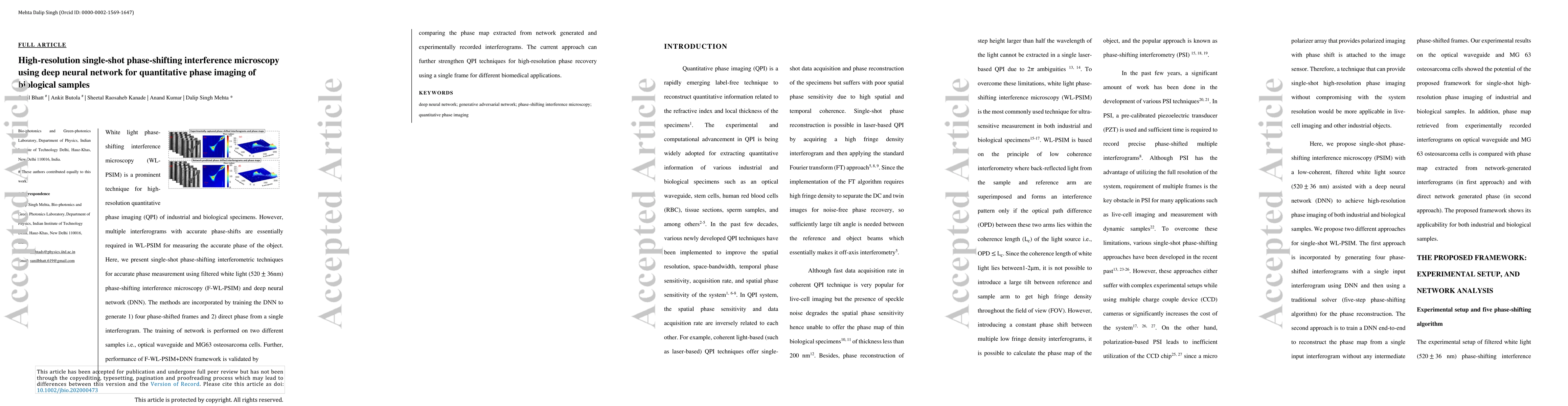 This paper introduces a high-resolution single-shot phase-shifting interference microscopy technique using deep neural networks to achieve quantitative phase imaging of biological samples. The method trains a DNN to generate multiple phase-shifted frames and direct phase from a single interferogram, enhancing quantitative phase imaging techniques for biomedical applications.