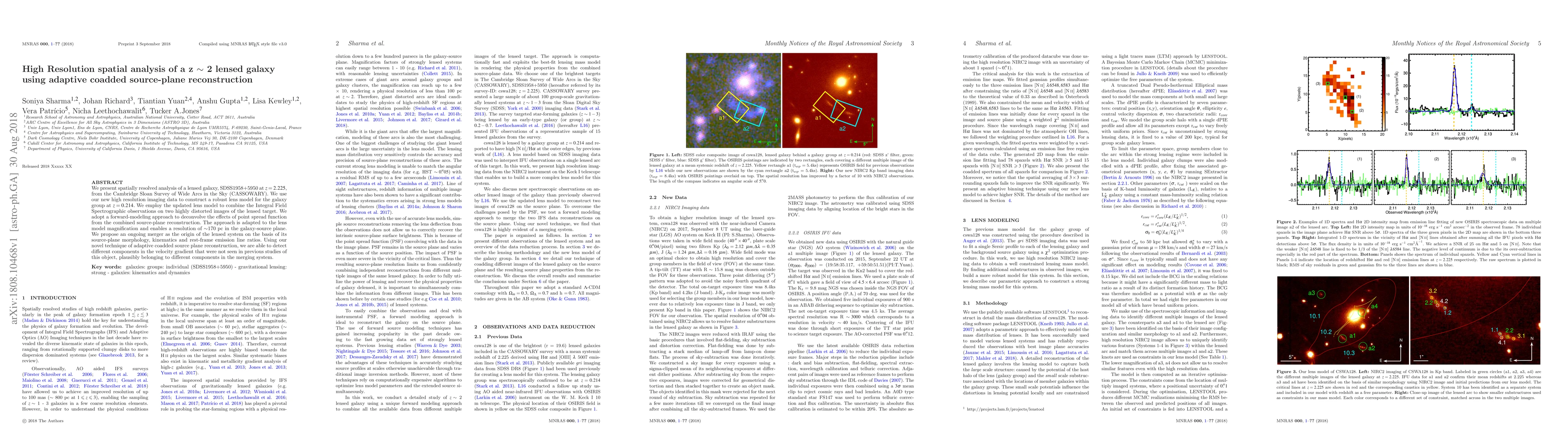 We present spatially resolved analysis of a lensed galaxy, SDSS1958+5950 at $z = 2.225$, from the Cambridge Sloan Survey of Wide Arcs in the Sky (CASSOWARY). We use our new high resolution imaging data to construct a robust lens model for the galaxy group at $z = 0.214$. We employ the updated lens model to combine the Integral Field Spectrographic observations on two highly distorted images of the lensed target. We adopt a forward-modeling approach to deconvolve the effects of point spread function from the combined source-plane reconstruction. The approach is adapted to the lens model magnification and enables a resolution of $\sim$170 pc in the galaxy-source plane. We propose an ongoing merger as the origin of the lensed system on the basis of its source-plane morphology, kinematics and rest-frame emission line ratios. Using our novel technique of adaptive coadded source plane reconstruction, we are able to detect different components in the velocity gradient that were not seen in previous studies of this object, plausibly belonging to different components in the merging system.