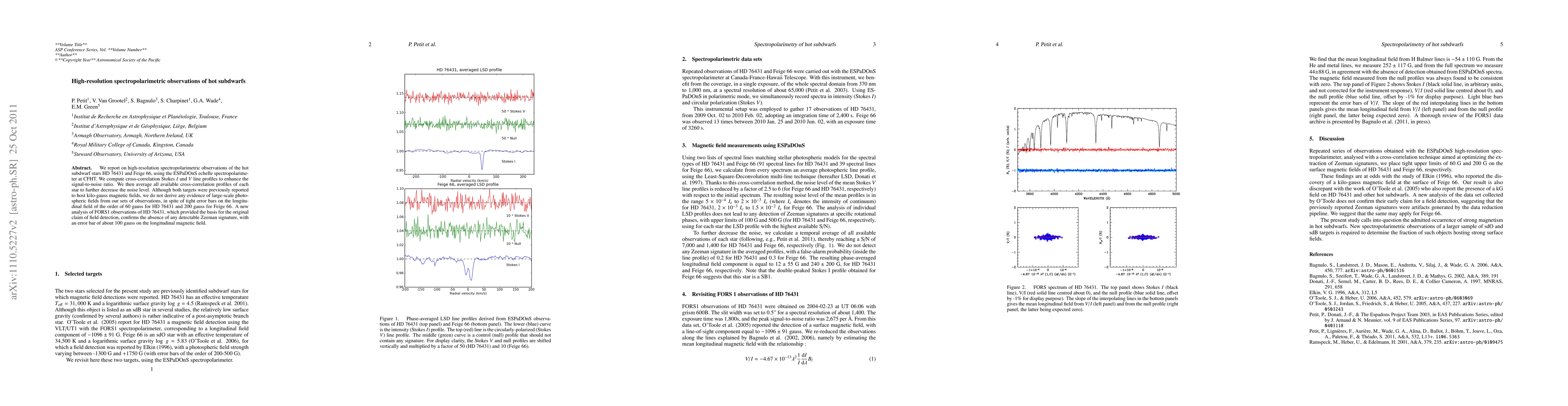 We report on high-resolution spectropolarimetric observations of the hot subdwarf stars HD 76431 and Feige 66, using the ESPaDOnS echelle spectropolarimeter at CFHT. We compute cross-correlation Stokes I and V line profiles to enhance the signal-to-noise ratio. We then average all available cross-correlation profiles of each star to further decrease the noise level. Although both targets were previously reported to host kilo-gauss magnetic fields, we do not derive any evidence of large-scale photospheric fields from our sets of observations, in spite of tight error bars on the longitudinal field of the order of 60 gauss for HD 76431 and 200 gauss for Feige 66. A new analysis of FORS1 observations of HD 76431, which provided the basis for the original claim of field detection, confirms the absence of any detectable Zeeman signature, with an error bar of about 100 gauss on the longitudinal magnetic field.