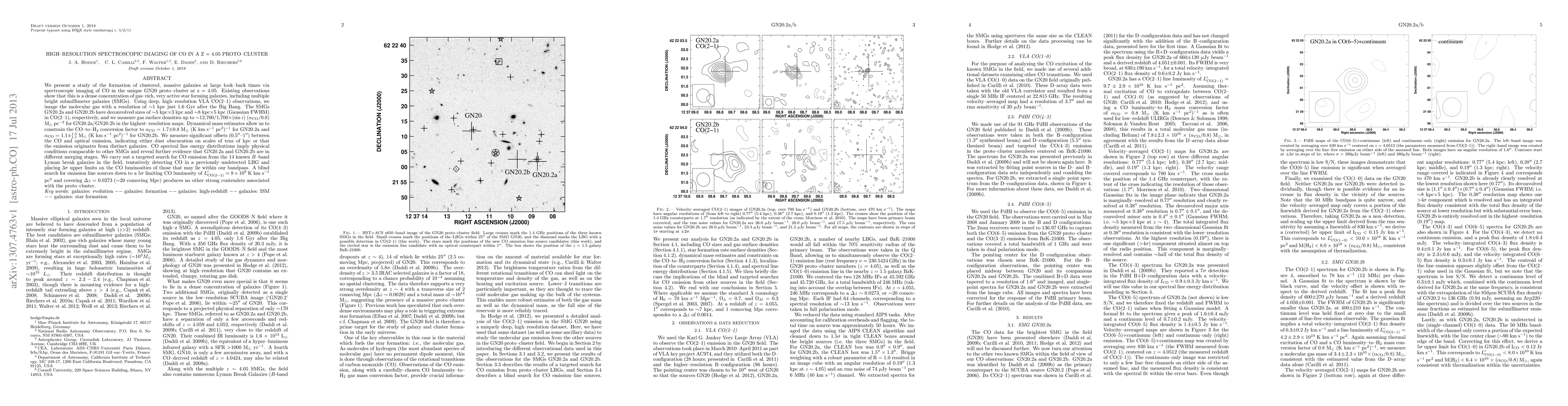 This study uses high-resolution VLA observations to spectroscopically image CO in the GN20 proto-cluster at z=4.05, revealing gas-rich, star-forming galaxies with high gas surface densities. The findings indicate significant offsets between CO and optical emissions, suggesting either dust obscuration or distinct galaxies, and provide constraints on the CO-to-H_2 conversion factor.