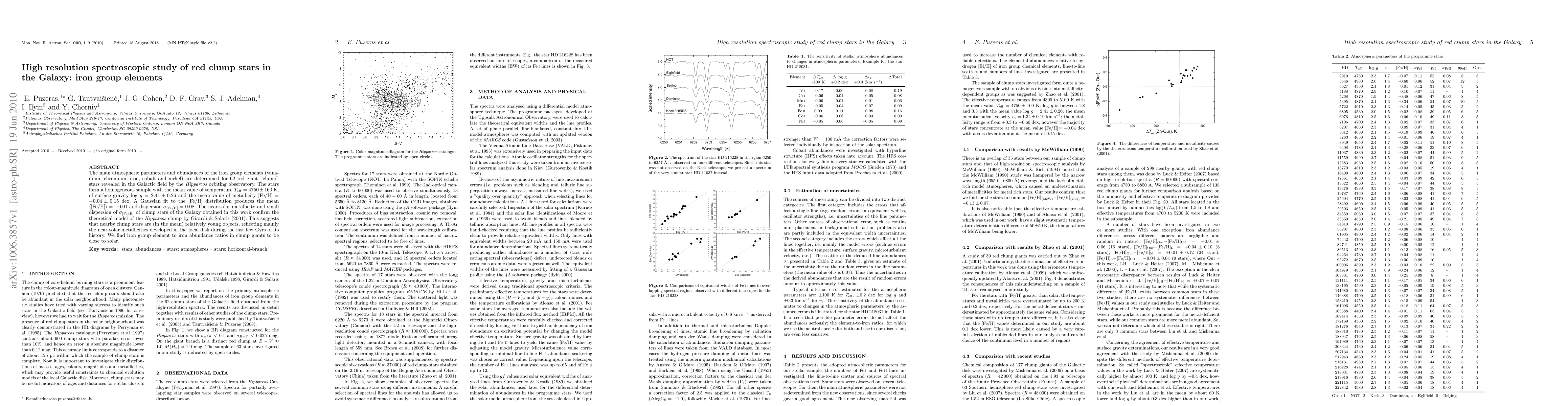 The main atmospheric parameters and abundances of the iron group elements (vanadium, chromium, iron, cobalt and nickel) are determined for 62 red giant "clump" stars revealed in the Galactic field by the Hipparcos orbiting observatory. The stars form a homogeneous sample with the mean value of temperature T=4750 +- 160K, of surface gravity log g = 2.41 +- 0.26 and the mean value of metallicity [Fe/H] = -0.04 +- 0.15 dex. A Gaussian fit to the [Fe/H] distribution produces the mean [Fe/H] = -0.01 dex and dispersion of [Fe/H] = 0.08 dex. The near-solar metallicity and small dispersion of [Fe/H] of clump stars of the Galaxy obtained in this work confirm the theoretical model of the Hipparcos clump by Girardi & Salaris (2001). This suggests that nearby clump stars are (in the mean) relatively young objects, reflecting mainly the near-solar metallicities developed in the local disk during the last few Gyrs of its history. We find iron group element to iron abundance ratios in clump giants to be close to solar.