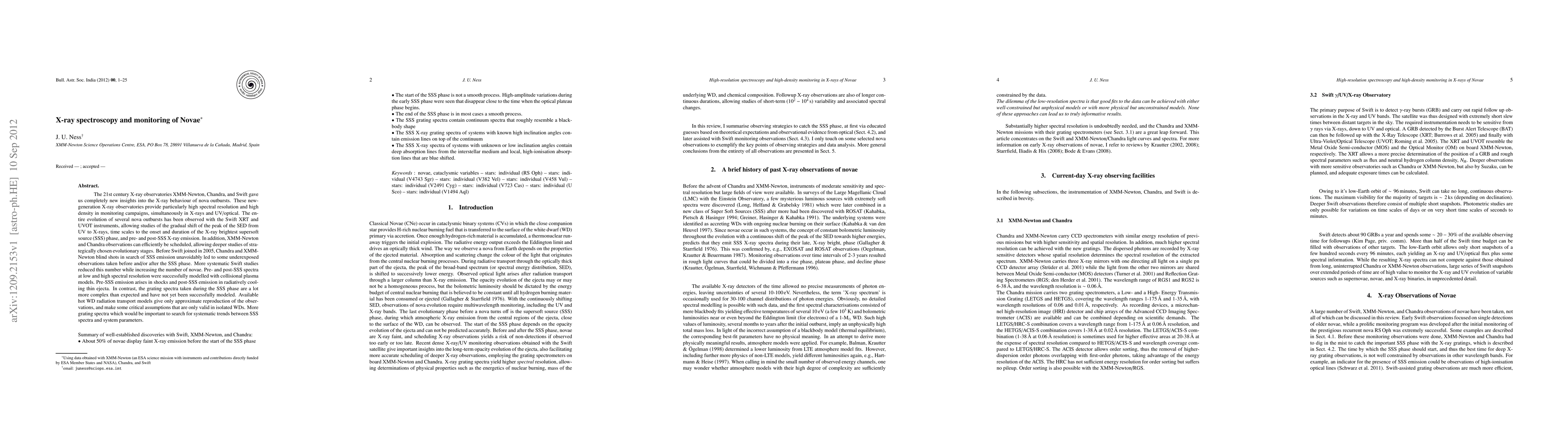 The 21st century X-ray observatories XMM-Newton, Chandra, and Swift gave us completely new insights into the X-ray behaviour of nova outbursts. These new-generation X-ray observatories provide particularly high spectral resolution and high density in monitoring campaigns, simultaneously in X-rays and UV/optical. The entire evolution of several nova outbursts has been observed with the Swift XRT and UVOT instruments, allowing studies of the gradual shift of the peak of the SED from UV to X-rays, time scales to the onset and duration of the X-ray brightest supersoft source (SSS) phase, and pre- and post-SSS X-ray emission. In addition, XMM-Newton and Chandra observations can efficiently be scheduled, allowing deeper studies of strategically chosen evolutionary stages. Before Swift joined in 2005, Chandra and XMM-Newton blind shots in search of SSS emission unavoidably led to some underexposed observations taken before and/or after the SSS phase. More systematic Swift studies reduced this number while increasing the number of novae. Pre- and post-SSS spectra at low and high spectral resolution were successfully modelled with collisional plasma models. Pre-SSS emission arises in shocks and post-SSS emission in radiatively cooling thin ejecta. In contrast, the grating spectra taken during the SSS phase are a lot more complex than expected and have not yet been successfully modeled. Available hot WD radiation transport models give only approximate reproduction of the observations, and make some critical assumptions that are only valid in isolated WDs. More grating spectra which would be important to search for systematic trends between SSS spectra and system parameters.