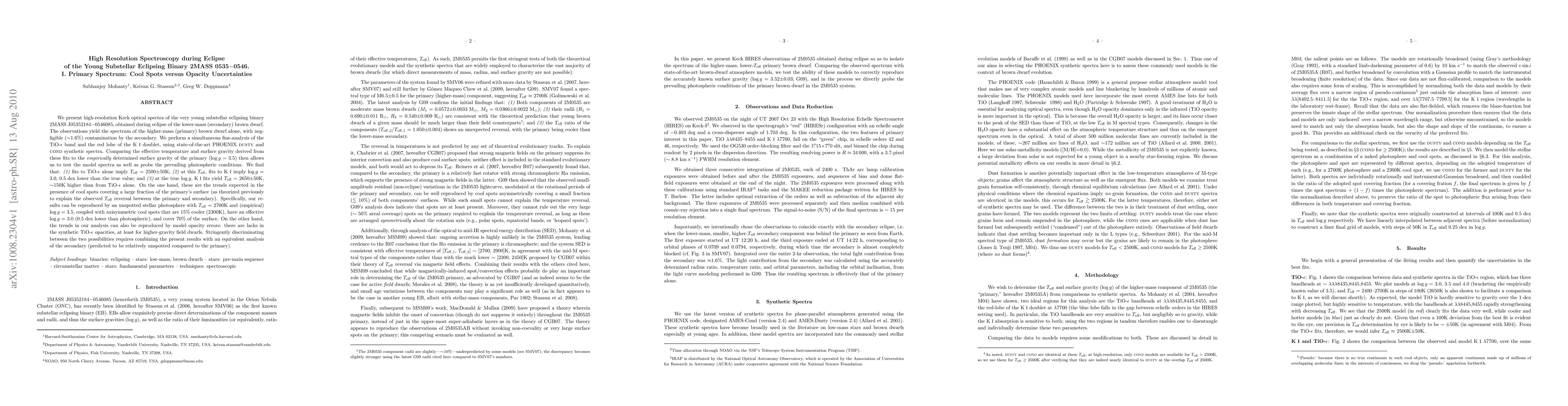 We present high-resolution Keck optical spectra of the very young substellar eclipsing binary 2MASS J05352184-0546085, obtained during eclipse of the lower-mass (secondary) brown dwarf. The observations yield the spectrum of the higher-mass (primary) brown dwarf alone, with negligible (~1.6%) contamination by the secondary. We perform a simultaneous fine-analysis of the TiO-epsilon band and the red lobe of the KI doublet, using state-of-the-art PHOENIX Dusty and Cond synthetic spectra. Comparing the effective temperature and surface gravity derived from these fits to the {\it empirically} determined surface gravity of the primary (logg=3.5) then allows us to test the model spectra as well as probe the prevailing photospheric conditions. We find that: (1) fits to TiO-epsilon alone imply Teff=2500 \pm 50K; (2) at this Teff, fits to KI imply logg=3.0, 0.5 dex lower than the true value; and (3) at the true logg, KI fits yield Teff=2650 \pm 50K, ~150K higher than from TiO-epsilon alone. On the one hand, these are the trends expected in the presence of cool spots covering a large fraction of the primary's surface (as theorized previously to explain the observed Teff reversal between the primary and secondary). Specifically, our results can be reproduced by an unspotted stellar photosphere with Teff=2700K and (empirical) logg=3.5, coupled with axisymmetric cool spots that are 15% cooler (2300K), have an effective logg=3.0 (0.5 dex lower than photospheric), and cover 70% of the surface. On the other hand, the trends in our analysis can also be reproduced by model opacity errors: there are lacks in the synthetic TiO-epsilon opacities, at least for higher-gravity field dwarfs. Stringently discriminating between the two possibilities requires combining the present results with an equivalent analysis of the secondary (predicted to be relatively unspotted compared to the primary).