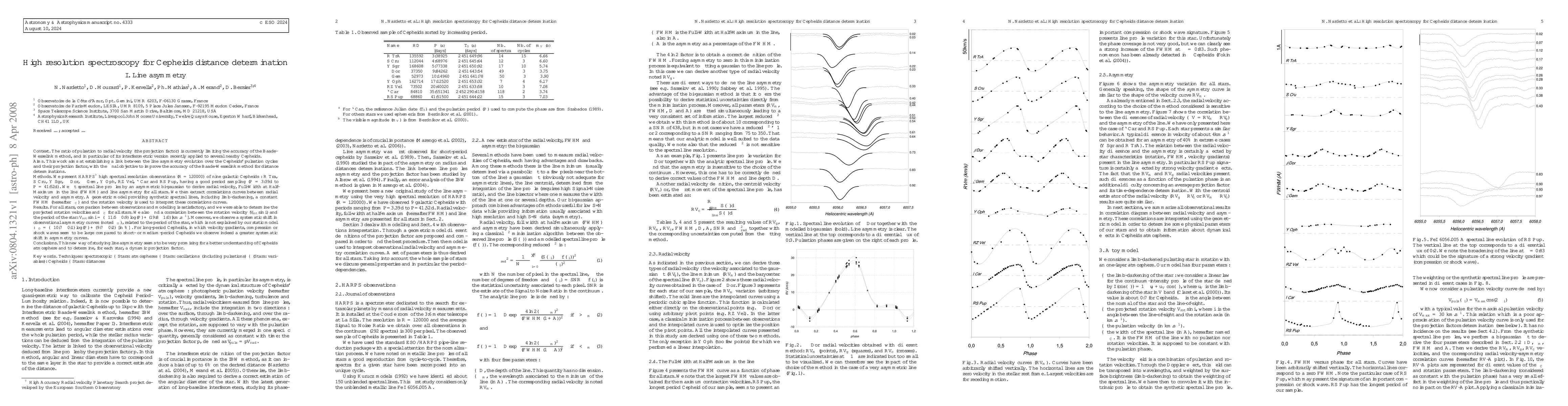 This paper investigates the link between line asymmetry in Cepheids' spectral lines and their pulsation cycles to improve the Baade-Wesselink method's accuracy for distance determination. High-resolution spectroscopy reveals a correlation between rotation velocity and star period, and identifies a systematic shift in asymmetry curves not explained by the static model, suggesting complex velocity structures in long-period Cepheids.