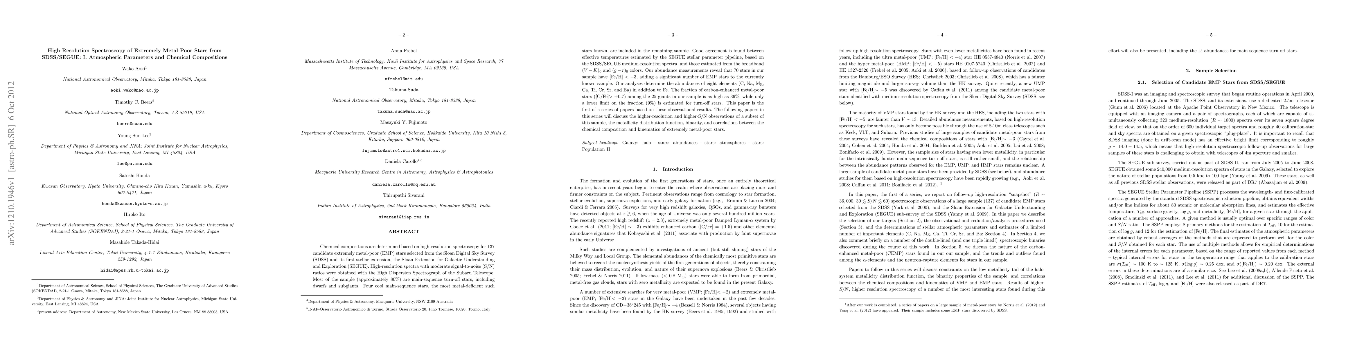 This study analyzes high-resolution spectra of 137 extremely metal-poor stars from SDSS/SEGUE, revealing 70 stars with [Fe/H] < -3. The research determines atmospheric parameters and chemical compositions, including abundances of eight elements, and finds a high fraction of carbon-enhanced stars among giants.