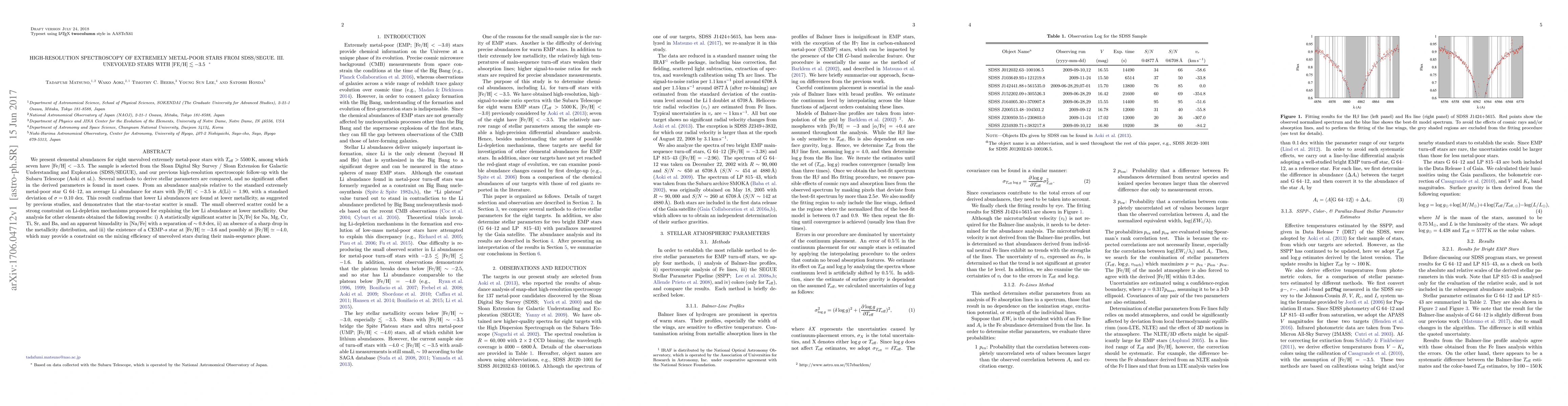This study analyzes high-resolution spectroscopy of eight unevolved extremely metal-poor stars from SDSS/SEGUE, finding an average lithium abundance of $A(\mathrm{Li}) = 1.90$ with a small scatter. The research also reveals significant scatter in several elemental abundances and identifies a CEMP-$s$ star, providing insights into stellar mixing efficiency.