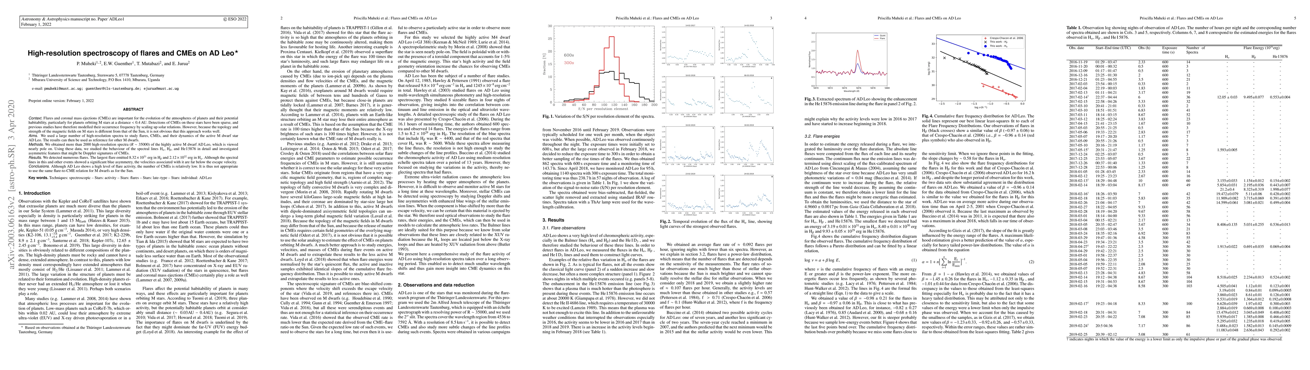 This paper uses high-resolution spectroscopy to study flares and coronal mass ejections (CMEs) on the M dwarf star AD Leo, finding high flare activity but a low CME occurrence rate. The study suggests that the flare-to-CME relation for M dwarfs differs from that of the Sun due to differences in magnetic field topology and strength.