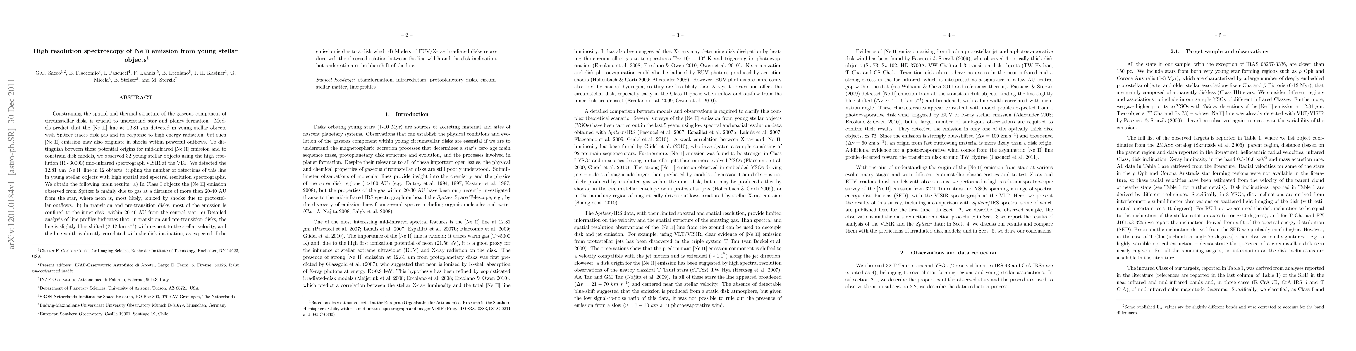 This study uses high-resolution spectroscopy to analyze Ne II emission in young stellar objects, finding that in Class I objects, the emission likely originates from shocks in protostellar outflows at distances of 20-40 AU. In transition and pre-transition disks, the emission is mostly from the inner disk, with line profiles indicating a disk wind and a correlation between line width and disk inclination.